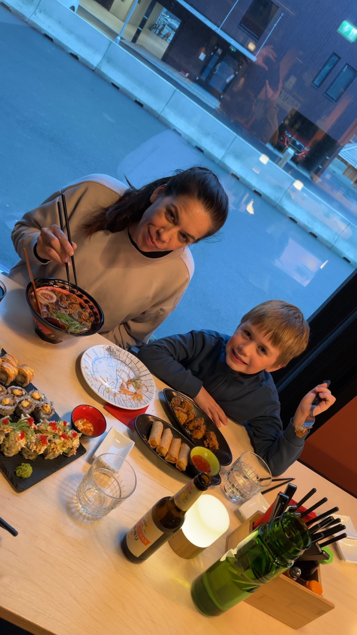Etter en utvidet middagsdiskusjon gikk vi til Nuga for bursdagsmiddag. Her fikk vi servert sushi, ramen og fritert kylling. Jeg spurte Isak om han ville sitte ved bursdagsbarnet. Han påstod at mamma ikke var noe barn, derfor ikke noe bursdagsbarn heller. På vei tilbake fra restauranten var vi innom butikken for å kjøpe lørdagsgodt, Isak ville ikke ha noe.... han ville bare hjem. Mamma ble igjen på butikken mens jeg og Isak gikk hjem.