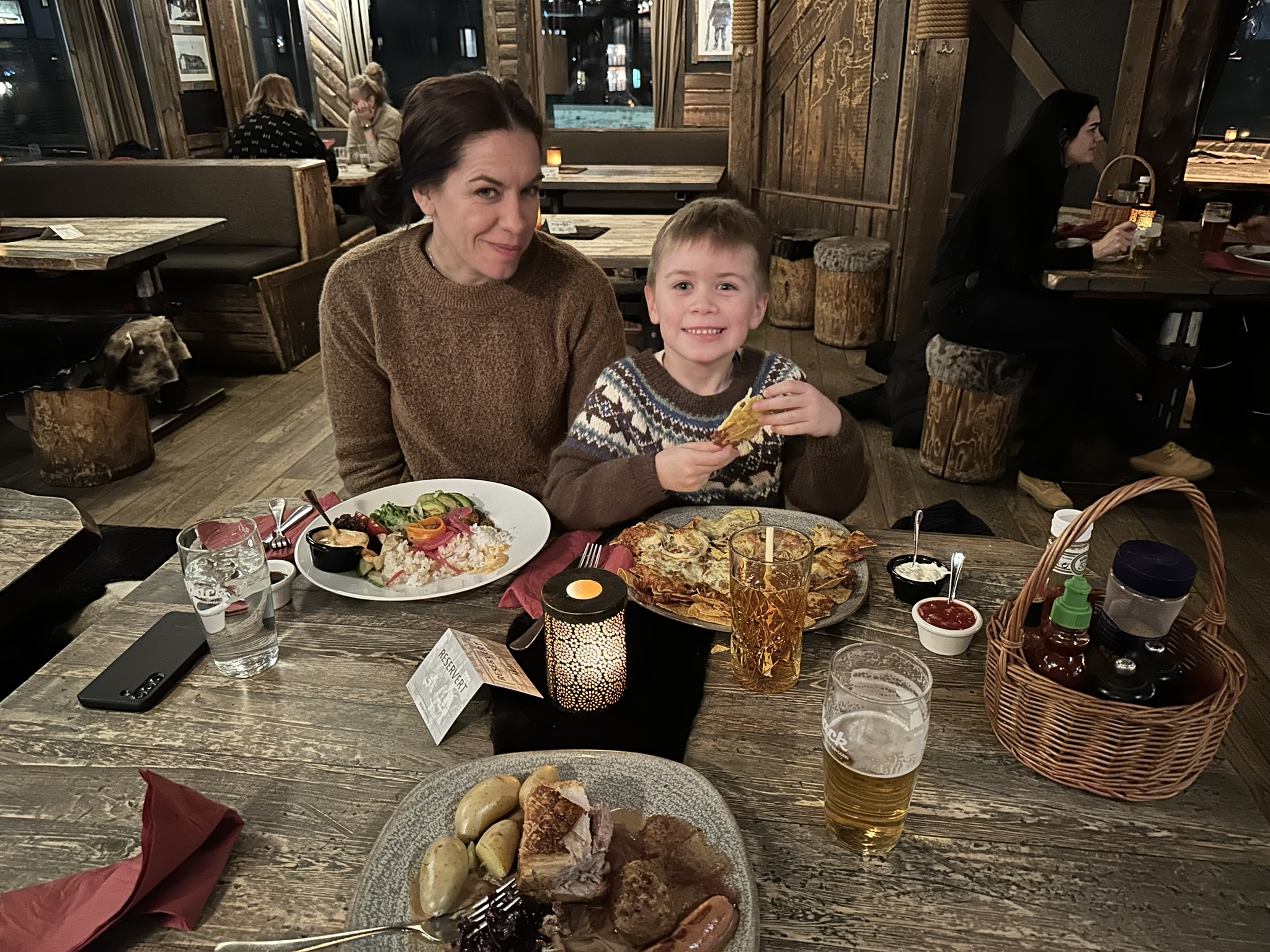 I dag har vi vært hjemme å lekt hele dagen, før jeg kom på at jeg vant i Eurojackpot på fredag. Vi gikk derfor ned til Svalbar for å spise, men der var det stengt dør, flaks at velkjente Kroa ligger like ved. Her ble det juletallerken, poke bowl og nachos. Alle var fornøyde, rødkålen var så uvanlig god at vi måtte spørre hvordan den var laget. Hovmesteren sa det var meget hemmelig, som visst nok var det samme som at han ikke hadde peiling. Like før vi skulle betale kom han og fortalte at kokken brukte solbærsirup og andefett. Premien på 120 kroner holdt ikke da, solbær er vel dyrt og vanskelig å oppdrive på tundraen...