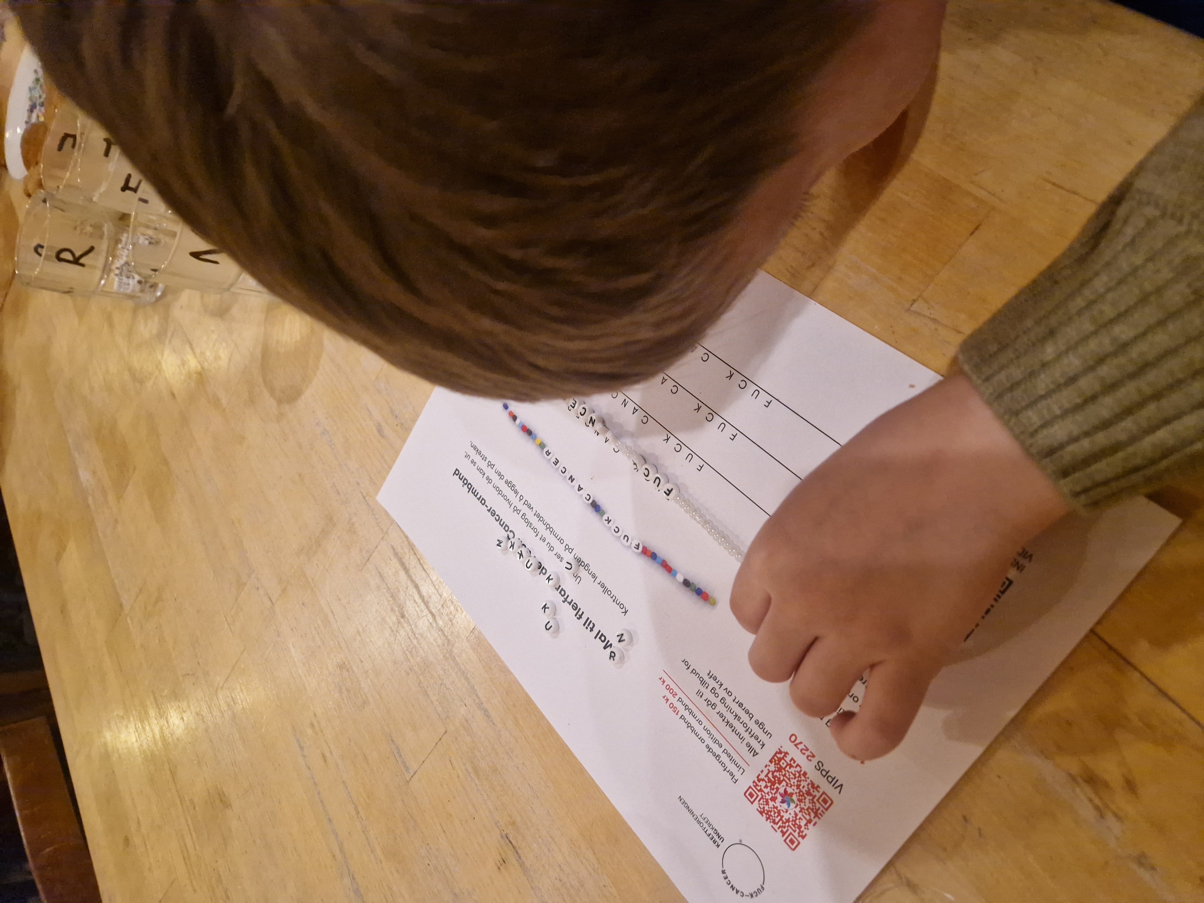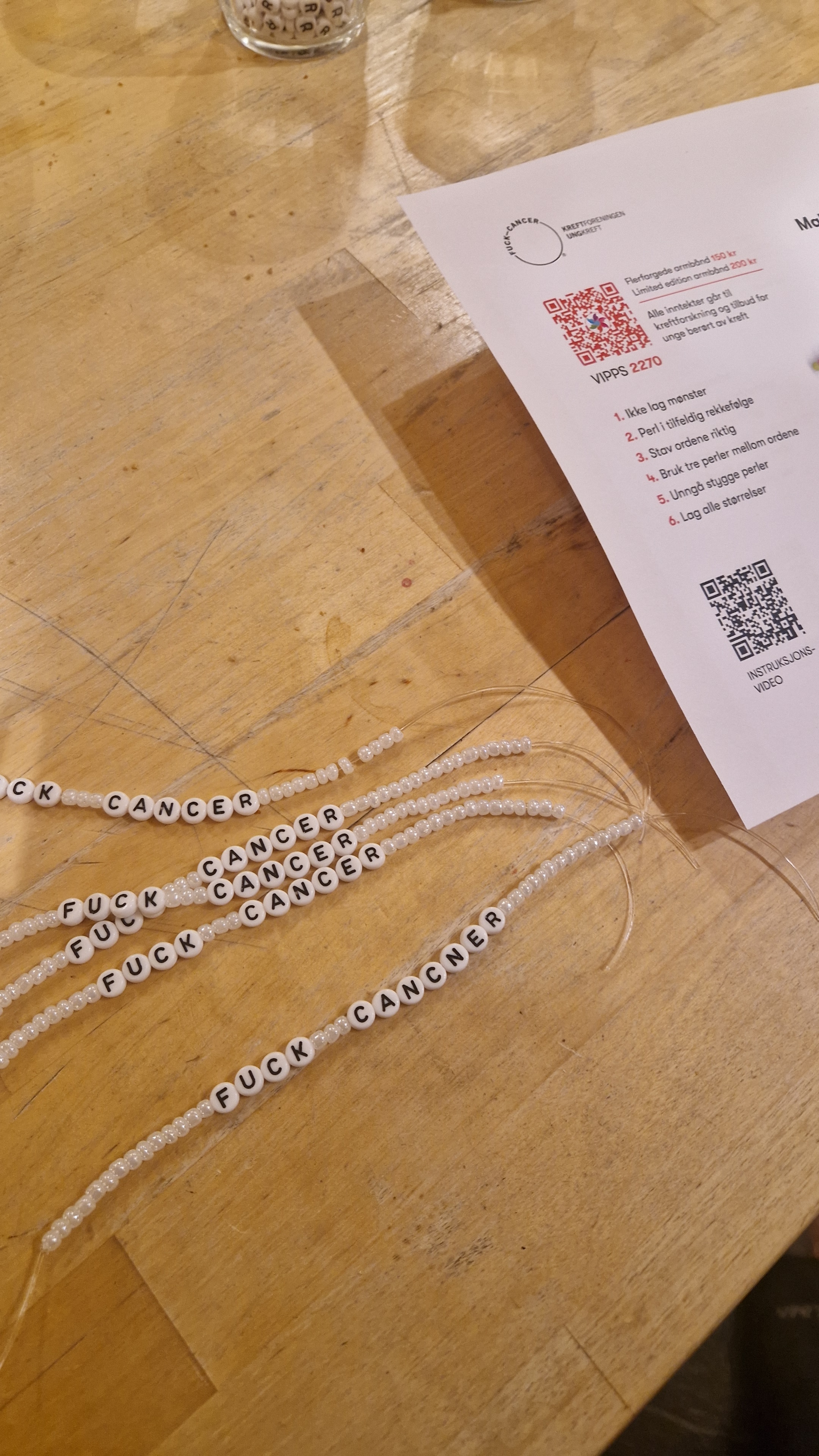 I dag var vi først en tur på Basecamp, de hadde besøk av noen av hundene sine fra hundegården. Etter at vi hadde hilst på de firbeinte tok vi turen opp til idrettshallen for litt allidrett. Når vi kom hjem så ble det en 15-minutters kunstpause, fullt påkledd på ganggulvet. Etter en halv banan bestemte Isak seg for at han ville ned til UNIS på perleworkshop. Hanne og Isak dro ned og lagde Fuck Cancer-armbånd, mens jeg laga middag. De kom hjem akkurat i det dagens derby starta nord i London. Isak hadde med armbånd til meg.