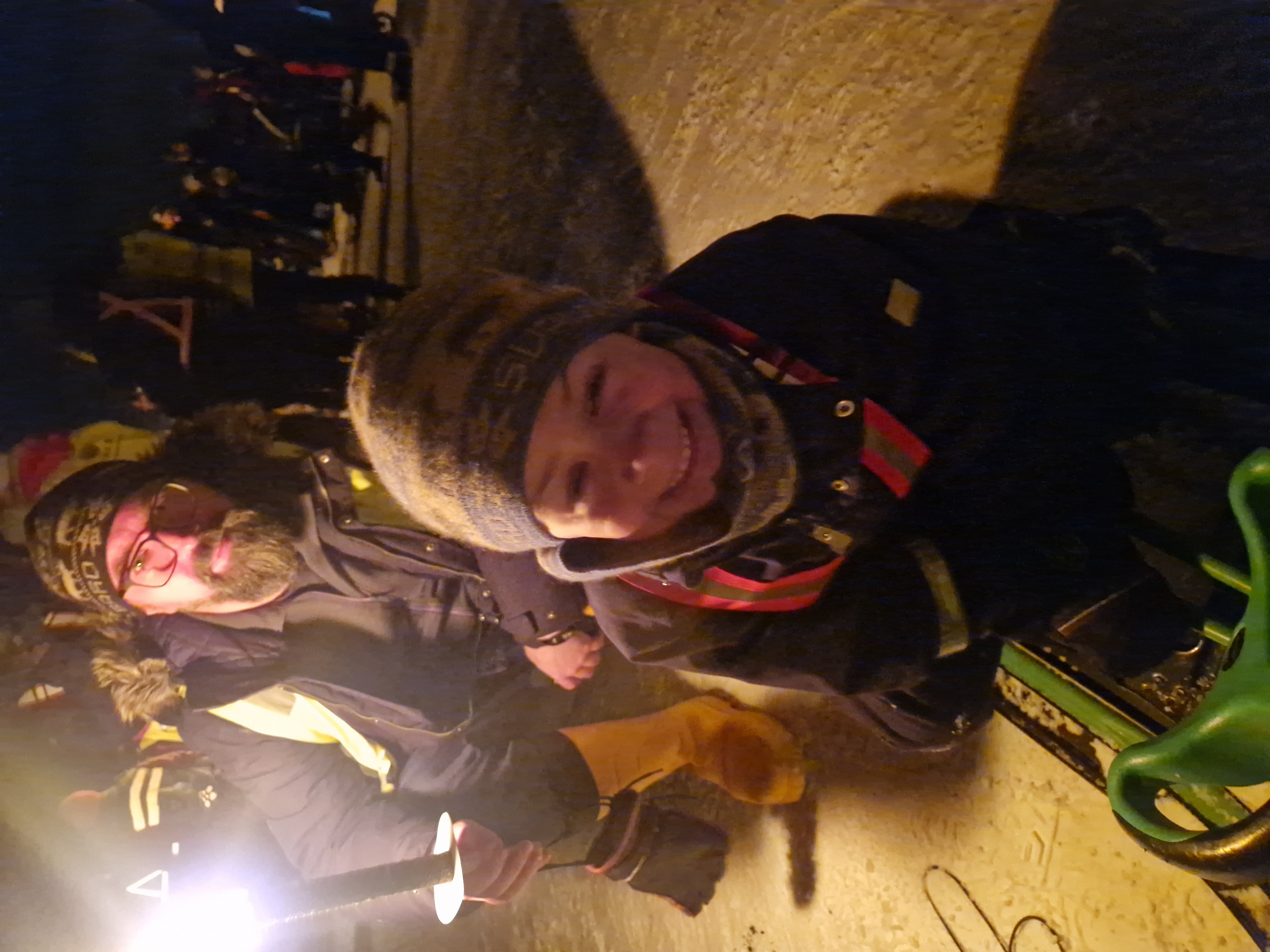 Første søndag i advent betyr nissemarsj og julegrantenning. Klokka ett slo vi følge med Alfred og gjengen opp til ærverdige Huset, det er jo et godt stykke å gå så guttene satt på rattkjelketaxi oppover. På Huset ble det litt sukkerpåfyll og lek før vi gikk ut og fikk utdelt fakler. Mange voksne prøvde seg, men fikk streng beskjed om at det var kun barn som fikk fakler. Marsjen gikk fra Huset og bort til foten av Gruvefjellet og Gruve 2. Oppe i gruva har "julenissen" slått på lysene og venter på barnas ønskelister. Alle forventningsfulle legger listene sine i postboksen nede ved veien, nissen henter de vel i løpet av natta. Det ble litt strekk i toget på veien nedover til torget, de voksne er jo veldig opptatt av å snakke med kjentfolk man tar igjen eller blir tatt igjen av.