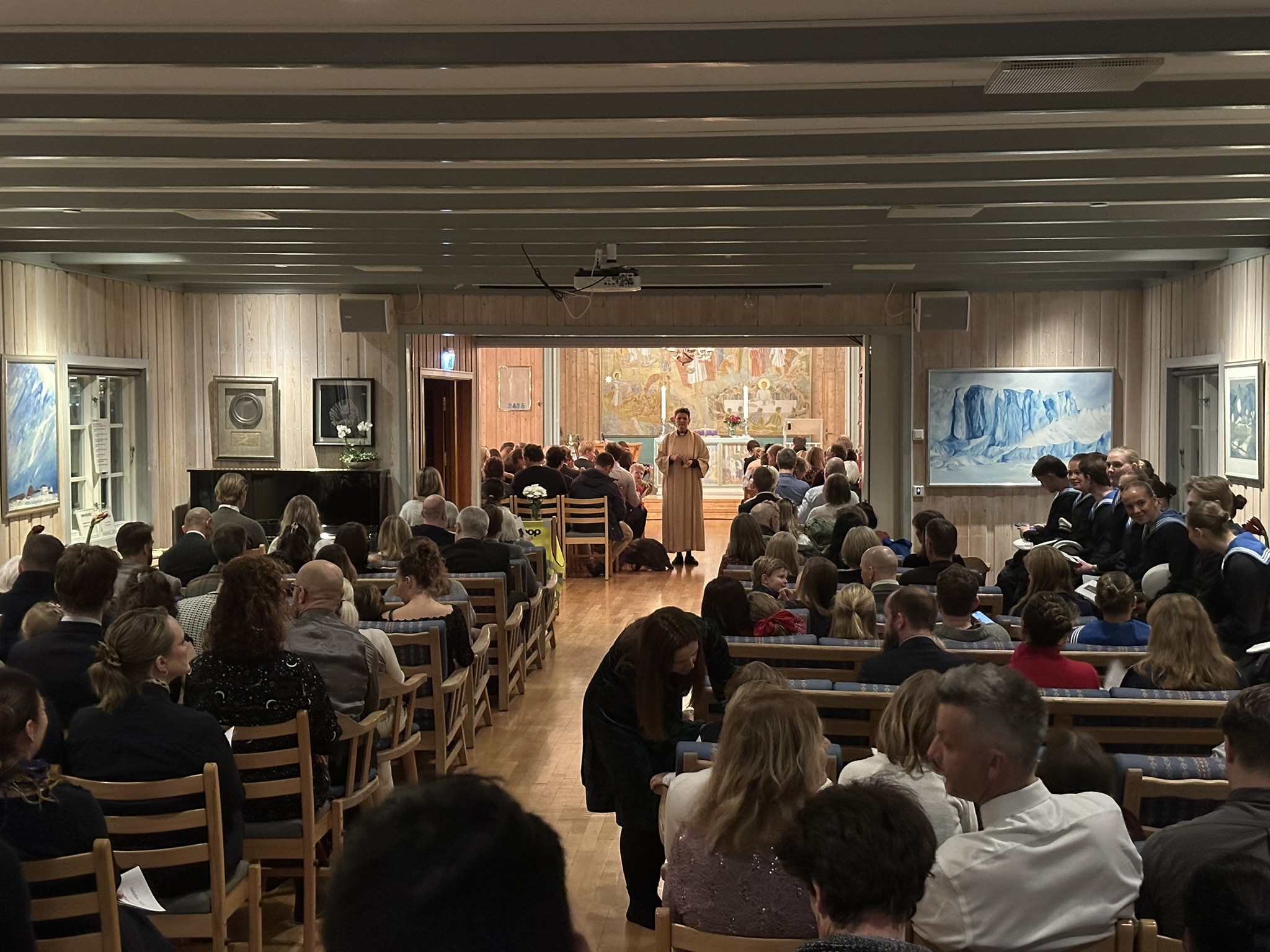 Kirka var stappfull, vi ble dermed stående i inngangsdøra, her sammen med vernepliktige soldater fra kystvakta. De sang ivrig med på salmene med varierende musikalsk hell, mens fartøysjefen brukte skuldra til Hanne som stativ for kameraet sitt. De skal ha for innsatsen, upåklagelig.