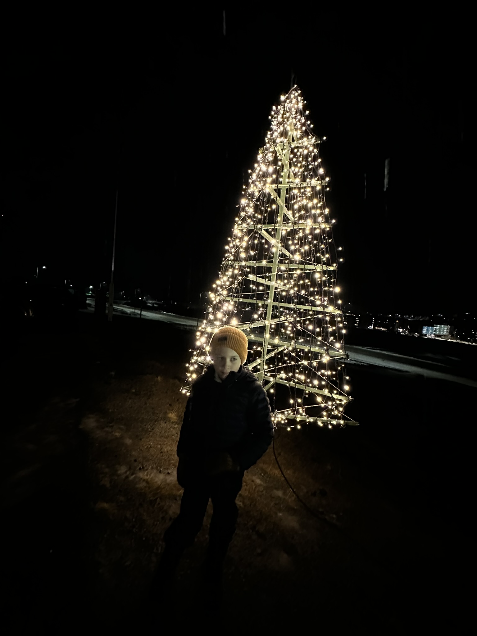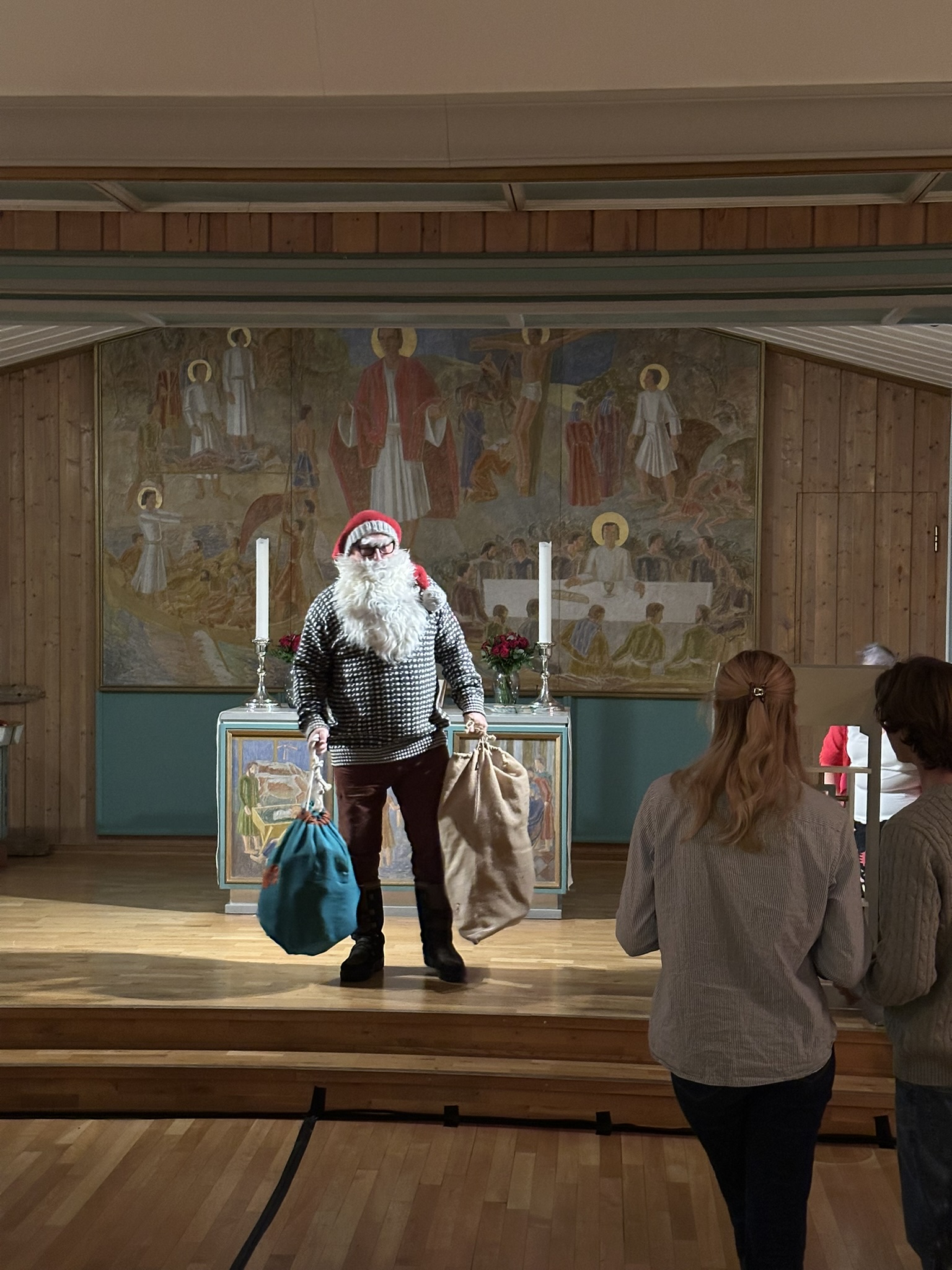 Etter en liten kort hvil hjemme, og en lengre forklaring rundt hva en juletrefest er og hvorfor det er morsommere enn å spille nintendo, tok vi turen opp til kirka for juletrefest. Her ble vi møtt av nordlys og ei dame som sa noe om en busslast av turister før vi ble jaga inn i kirka. Vi fant de siste ledige plassene i stua før vi kasta oss med på synginga. Etterpå spratt julenissen ut av sakristiet og inn ved alteret. Han hadde ikke med altervin, men poser med godteri til barna. Jeg har ikke hørt om noen andre steder man får utlevert godteri av en julenisse fra et alter... All mulig respekt og applaus for det valget!