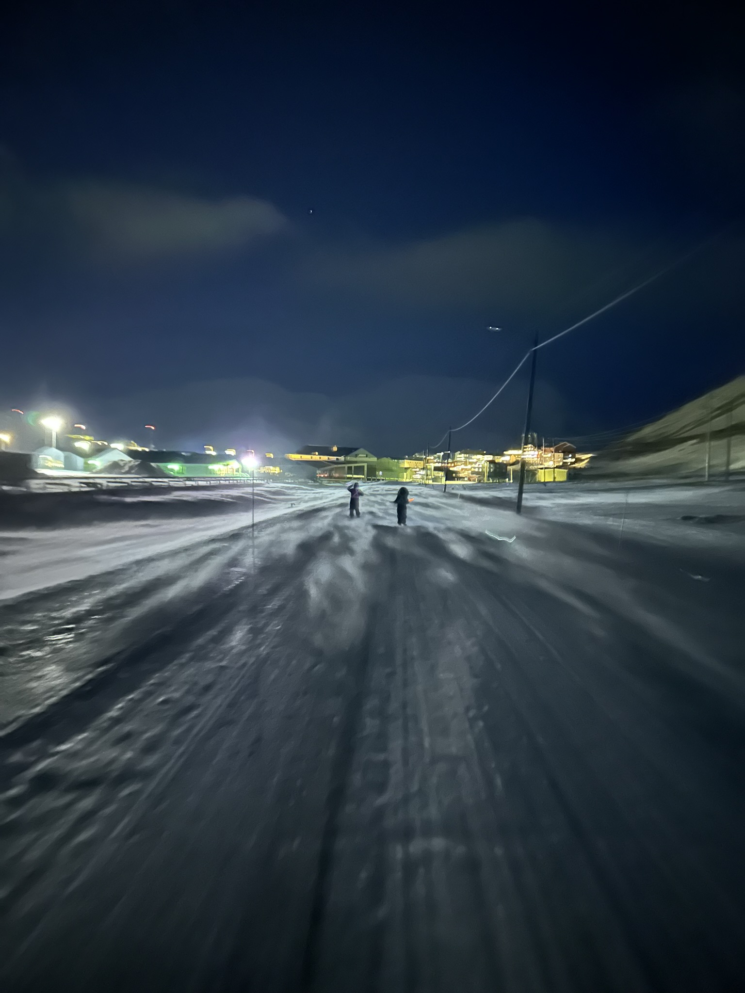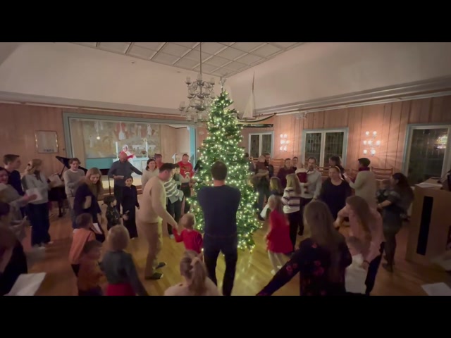 Klokken 22:00 er det oppmøte på torget for de som ønsker, her er planen å gå rundt juletreet. Isak og Hanne gikk hjem med restene av riskremen mens jeg gikk nedover for å se hva dette var for en greie. Og her var det magisk stemning. Det høres på synginga at det er mange nasjonaliteter i Longyearbyen :) Etter rundgangen er det fritt frem for å bli med på KB for forfriskninger, presten er også med. Jeg gikk hjem med høylytt allsang fra torget bak meg, "Vinsjan på kaia". Fikk med meg et par vers før vinden endelig tok resten.