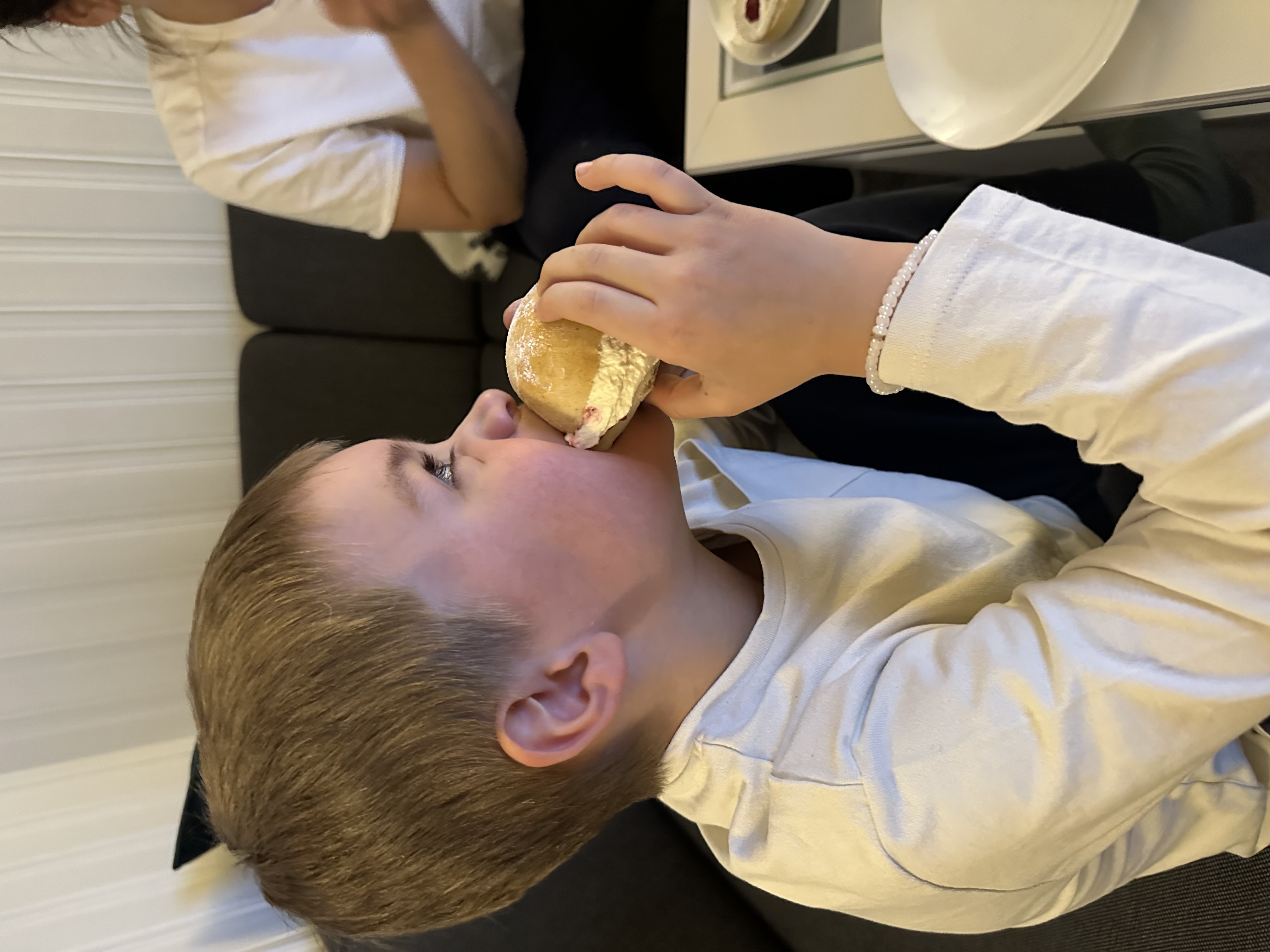 Søndag, og like kaldt, men vi hadde rennende vann i krana. Litt OL før jeg og Isak gikk ned til Nordover for karneval, maskeverksted og kino. Film; Håndbok for superhelter. Når vi kom hjem hadde Hanne laget fastelavnsboller til etter middag. Nå er stuebordet fult av krem og syltetøy. Siden vi har snakket mye om patenter, på runde tre grov Isak ut alt innholdet i bollene for å få plass til mer krem og syltetøy.