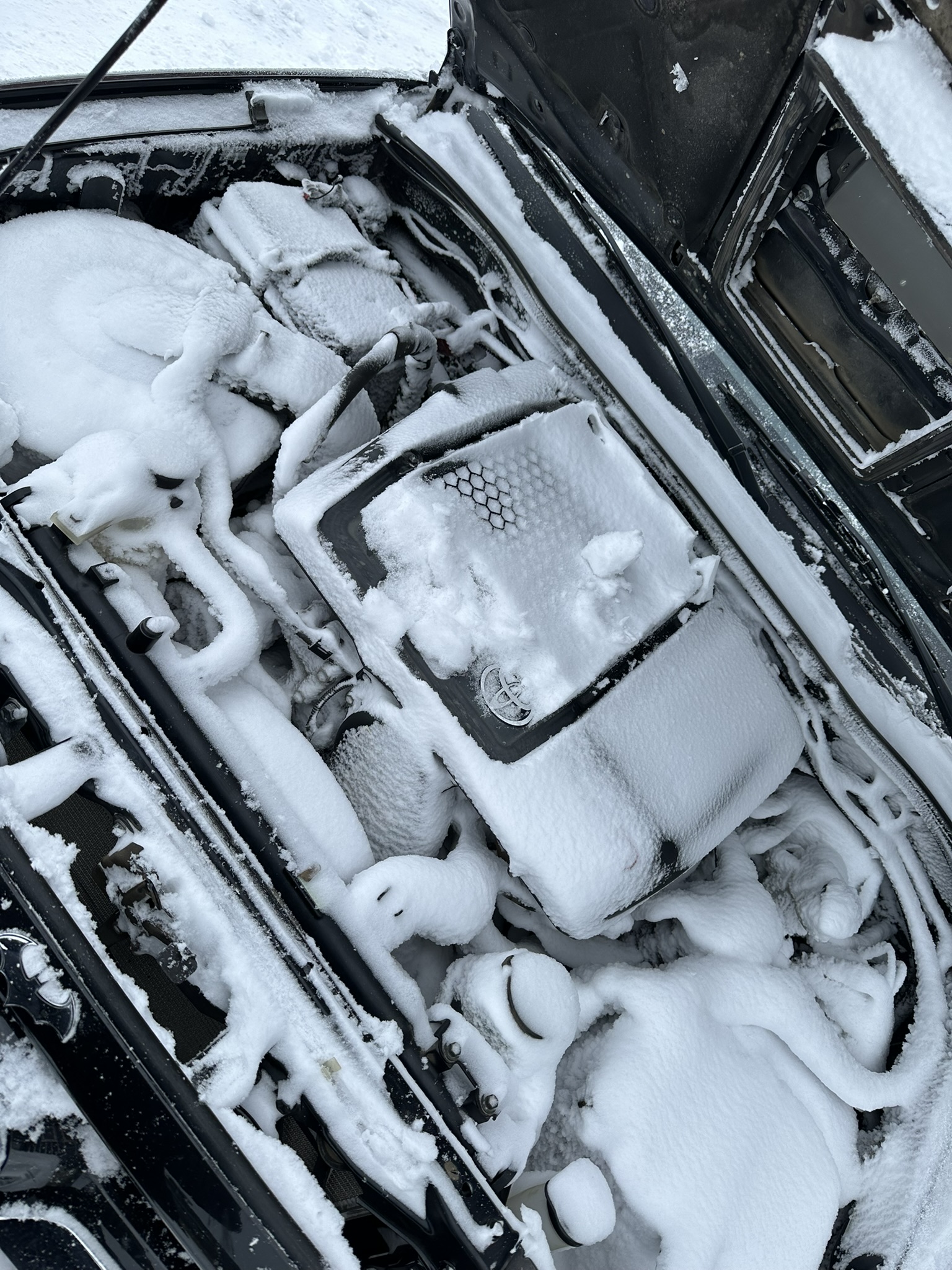 Vind... natt til søndag ble det målt 57,9 meter i sekundet i kastene oppe på Platåberget(fjellet som danner vestsiden av Longyeardalen). Det er da ganske kjapt? Rista godt i spisshuset, og vi ble vugga i søvn i senga. At huset er bygd på påler hjelper en del på det. Det snødde også, så vi kan vel kalle det en snøstorm. Vi så ikke lyset i lyktestolpen rett utenfor her. En effektiv liten påminnelse om at vi faktisk bor i Arktis. Legger ved et bilde og video av motorrommet på bilen, er ikke mye som slipper unna snøkorn i lydens hastighet. 3-liters dieselmotor bråker til vanlig, men den var mer på lydnivå med en Toyota Yaris... hybrid etter snøangrepet. Sluffa var også fylt med 25cm snø, bittelite hull i luka.
