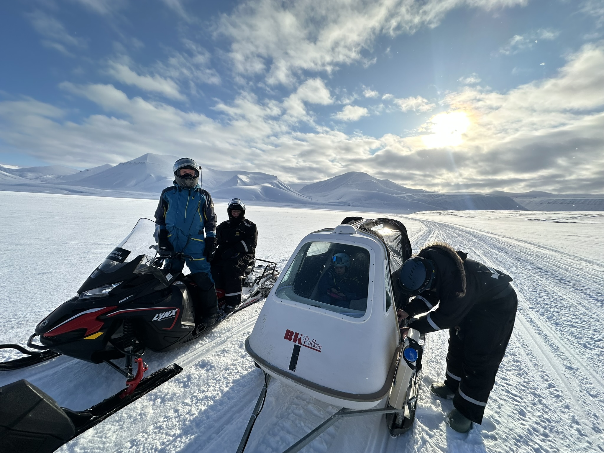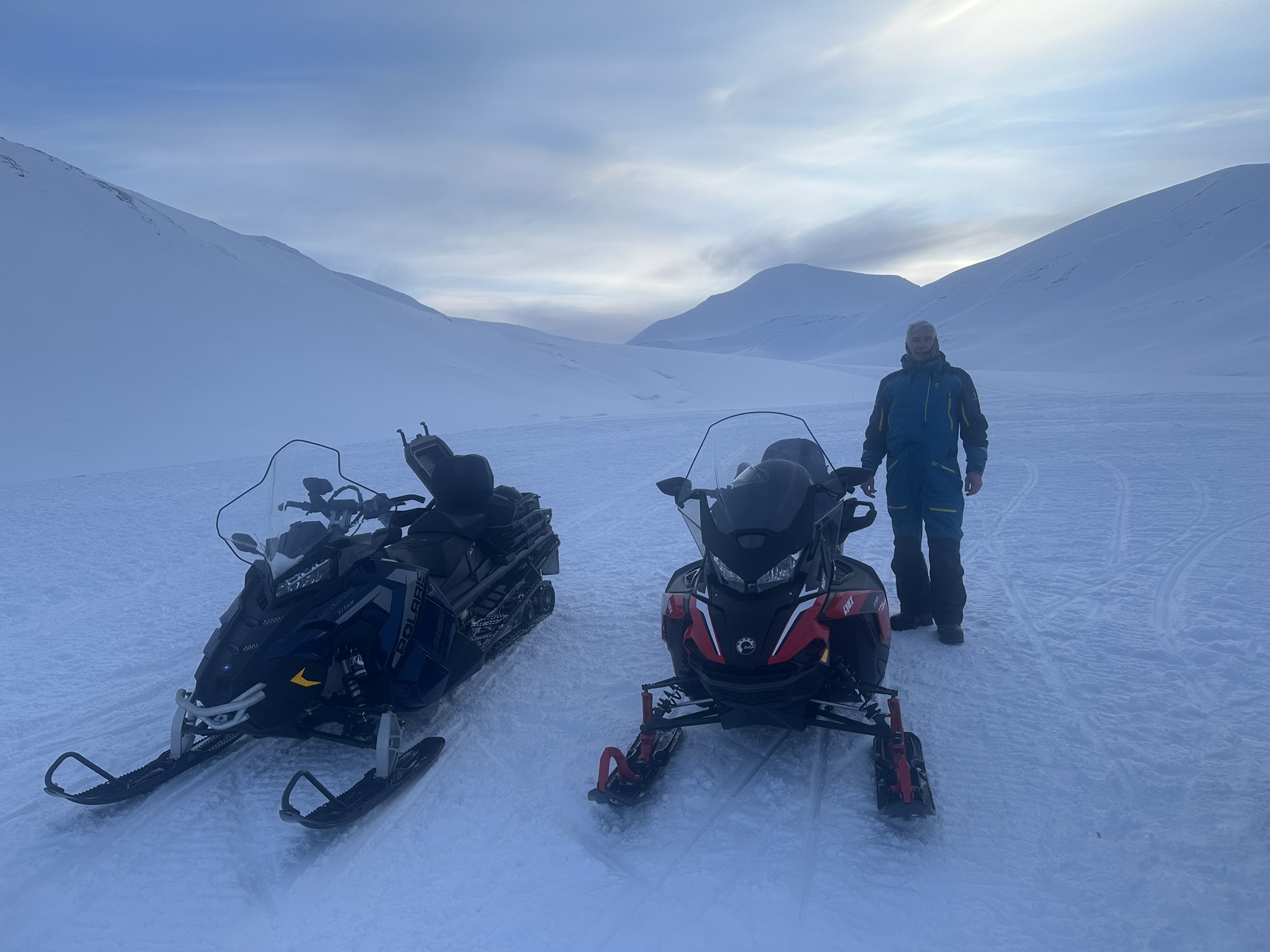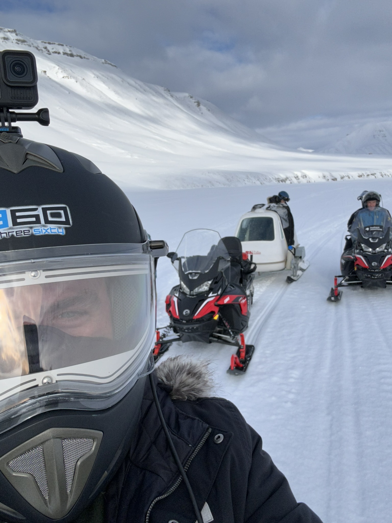 På vei hjem så følte undertegnede seg såpass sikker på veien tilbake så kjørte på feelingen, ikke før vi kom til Fardalsbakken merka den innebydge GPS'en at vi hadde feil kurs, eller, kjørt feil dal.. Man kan kjøre opp og over Longyearbreen for å komme hjem. Men bakken er bratt og litt risikabel med tung last. Også morena nedover kan være utfordrende med sluffe på slep. Sammen tok vi en demokratisk avgjørelse om å snu og kjøre Fardalen ned igjen. Offisielt var det guiding, men i realiteten en 1,4 mil omvei. Til mitt forsvar var det første gang i området. Kjører uansett på GPS'en neste gang.