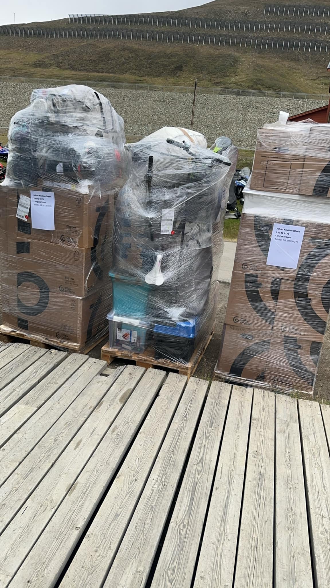 Tilbake til svaneøgla på vei til lunsj for dagen, rykende ferske kanelboller til alle sammen. De ringer fra Bring. Jeg må løpe opp for å ta i mot flyttelasset. I Longyearbyens ånd så får flyttelasset bare stå ute i friluft uten vektere eller videoovervåkning.