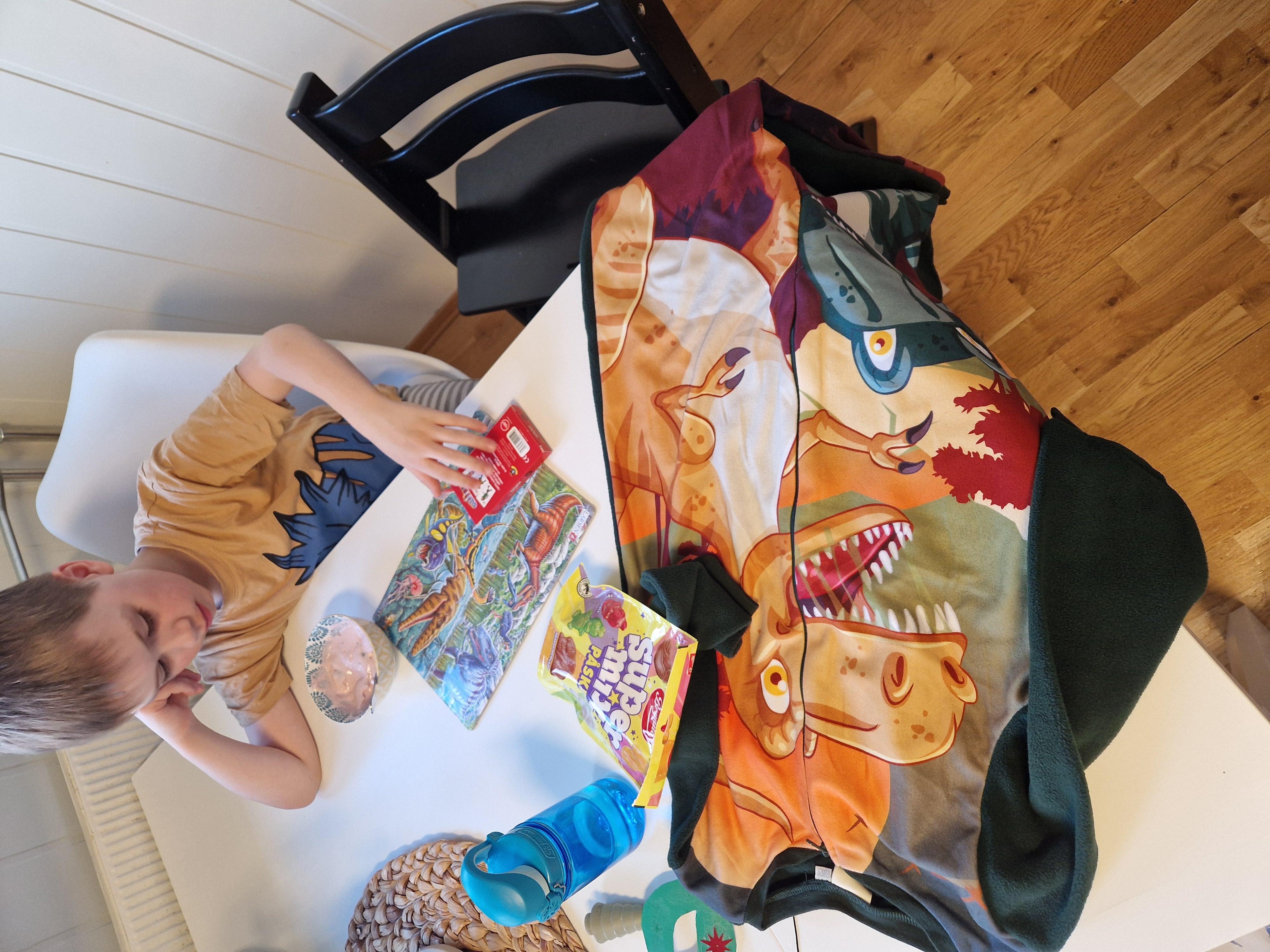Ellers har Isak fått sin siste bursdagsgave i posten, her ble det lagt puslespill med det samme. Den gode dinosaurdrakten har vært på mange ganger allerede.
