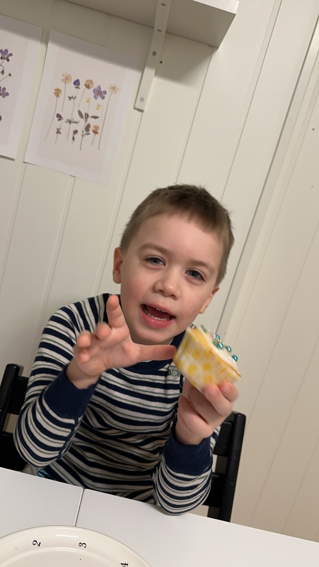 Feiring ble det jo litt av i dag selvsagt, først i barnehagen så hjemme. Isak fikk bestemme middag og alle vi møtte, og gikk forbi på vei hjem, vet at vi skulle ha pannekaker, muffins og gelé i løpet av ettermiddagen. "BARE søte ting i dag" som han sa. Han tenkte litt over akkurat det, og mente at pannekaka kunne serveres med morrpølse. Uprøvd for vår del, men bursdagsbarnet bestemmer. Det var da helt ok.