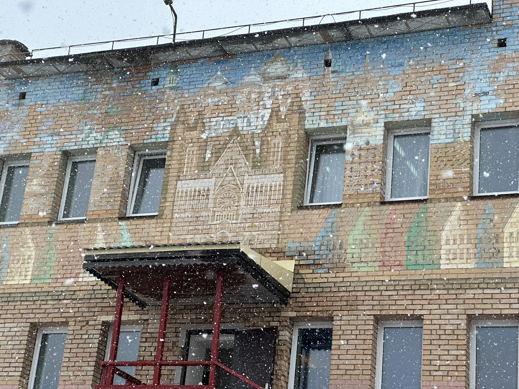 Det bor ca. 40 barn i Barentsburg, russiske og ukrainske. Skolebygget var fint dekorert. For å "hylle" norsk suverenitet på Svalbard så var skolen utsmykket med maleri relatert til Norge. Vi fant til og med Nidarosdomen på veggen. Er nok brukt drygolin.