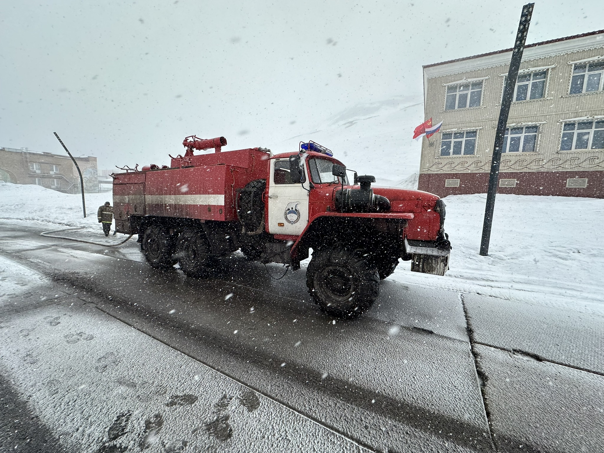 Borti gata møtte vi en brannbil. Om jeg ikke helt har glemt kjenningstestene fra førstegangstjenesten, en Ural 4320. 6 hjulstrekk fra den kalde krigen. Her sto to brannmenn og spyla ut av grøftene. Trykket i brannslangen var lite å skryte av.