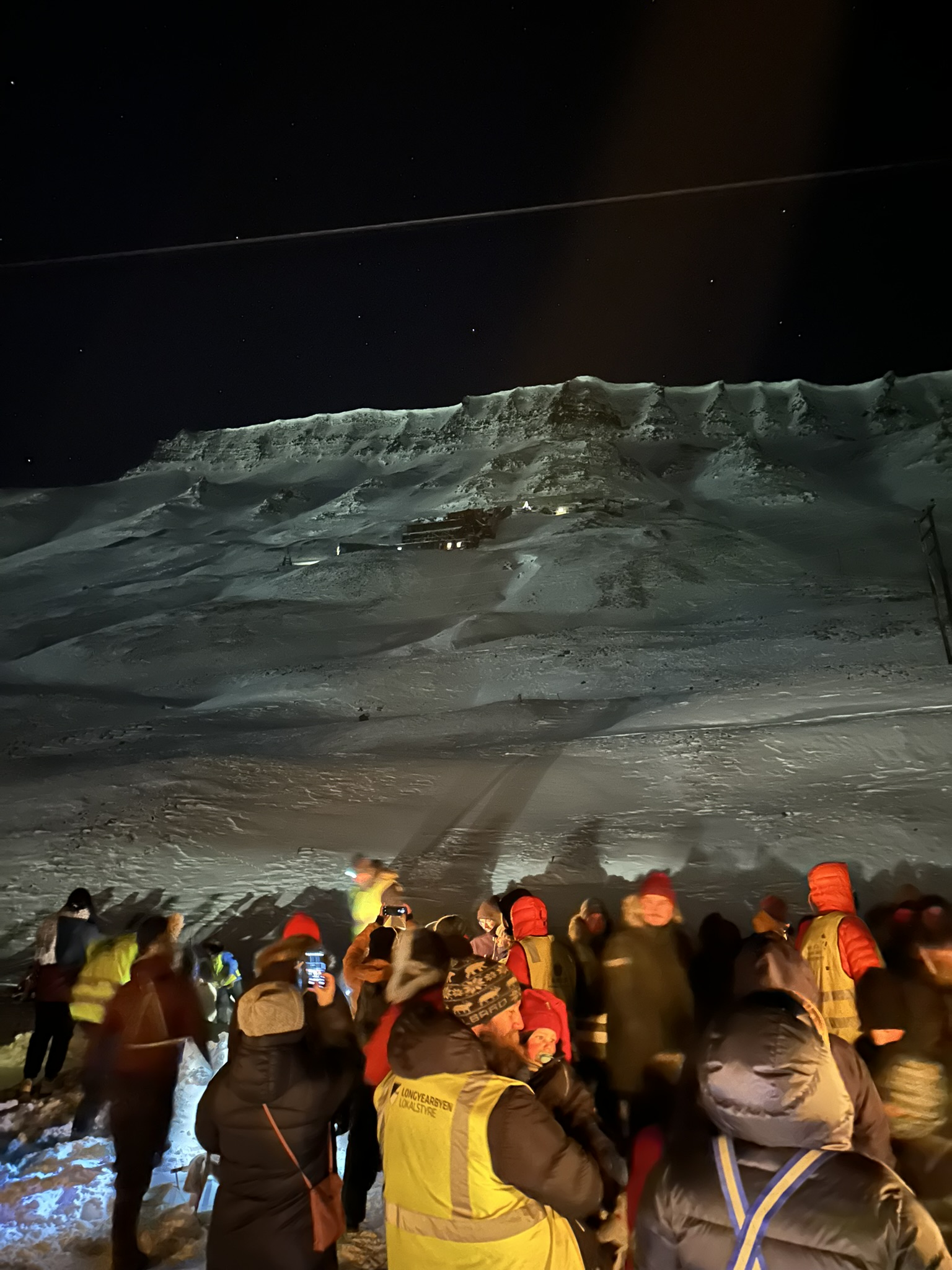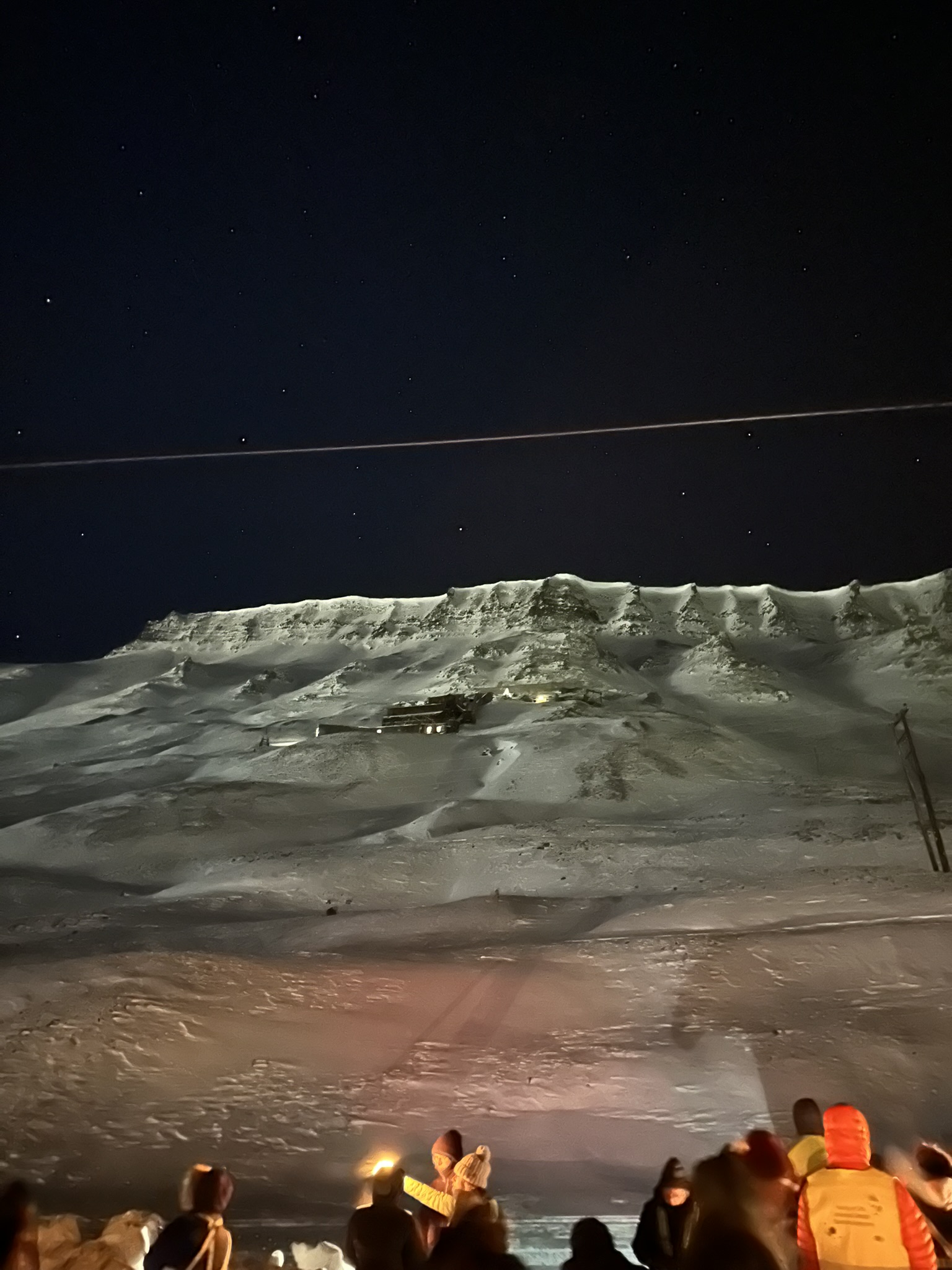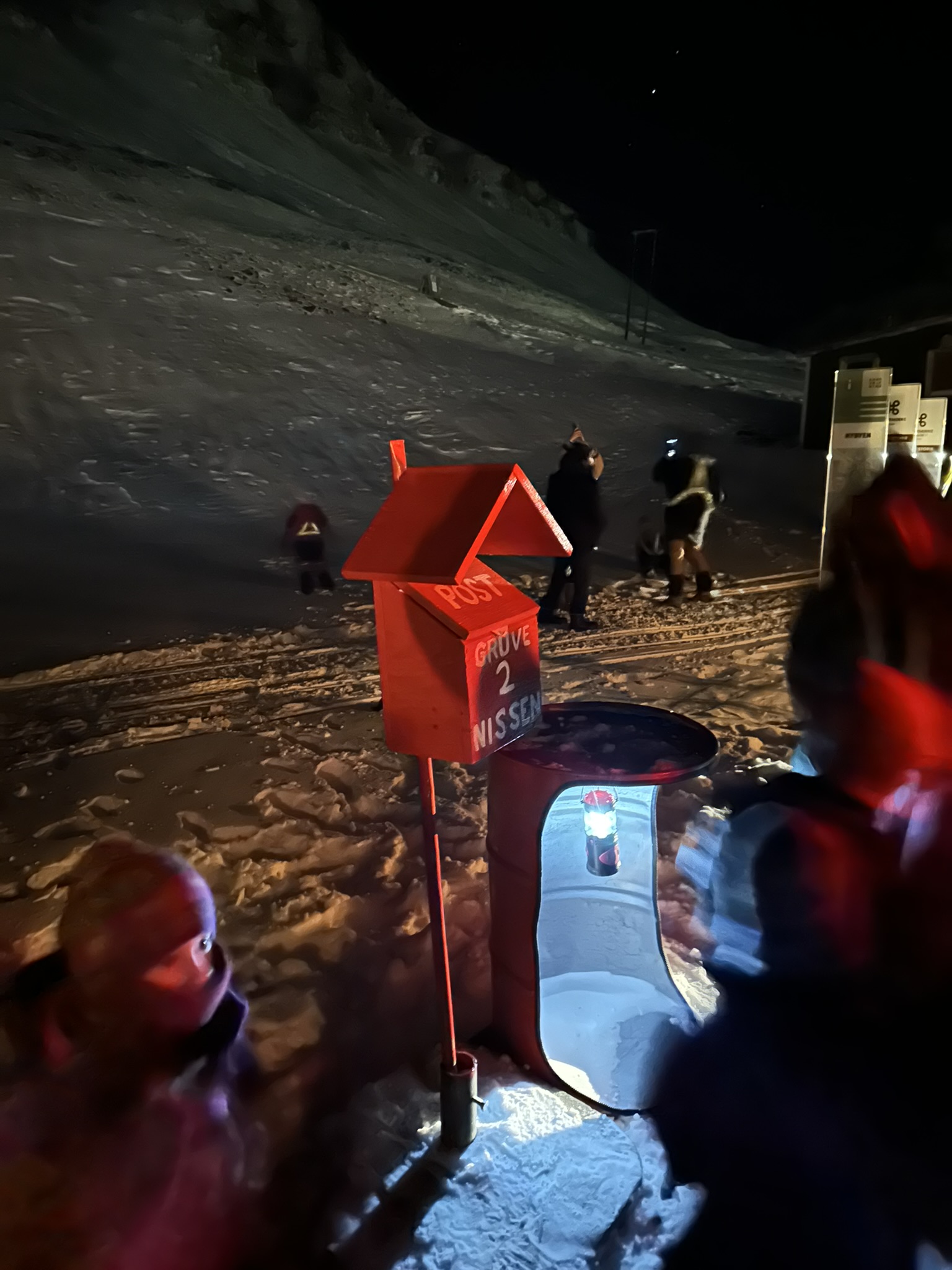 Litt utpå dagen gikk vi opp til legendariske Huset. Her var det litt kaffe og boller før vi gikk ut for å delta i fakkeltoget bort til foten av Sarkofagen, hvor Gruve2 ligger. Lokalstyret slår av gatelysene, og vi kunne se stjerneklar himmel og et svakt nordlys over oss og fakkeltoget. Det sies det at det er nissen som er på besøk i Gruve 2 og at det er han som har slått på lysene der oppe. Nissen har satt opp postkasse ved veien hvor barn(og voksne) kan legge oppi julegaveønskene sine. Isak la selvfølgelig sin liste i en stappfull postkasse.