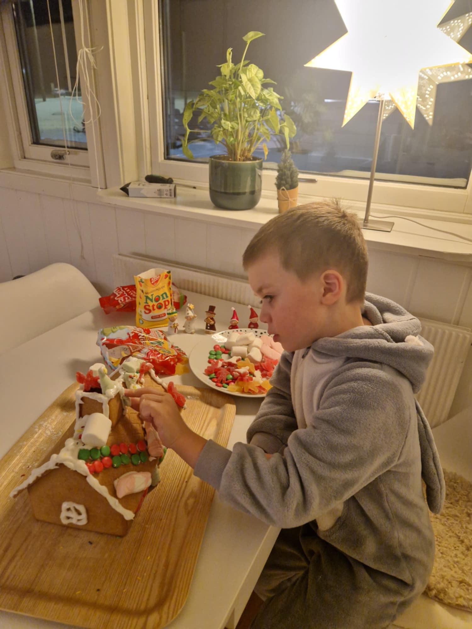 Rampenissen hadde søla mel på kjøkkenbordet og hadde gjort klart for pepperkakehus-bygging og pynting. Snill rampestrek det da.