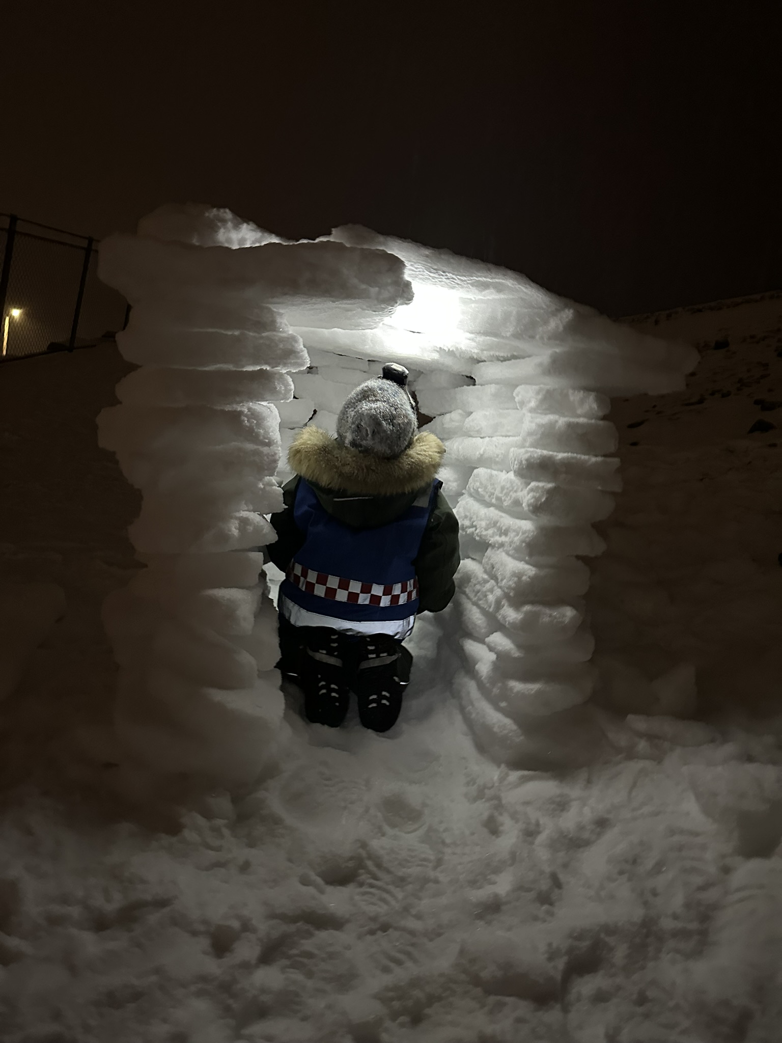Kanskje er det greit å kunne å lage seg skjul også? Derfor satte jeg og Isak opp en «iglo» etter beste evne. Isak klatra fjellet etter materiale. Også bygga vi et lite hus. Til slutt kom Hanne å laga dør :)
