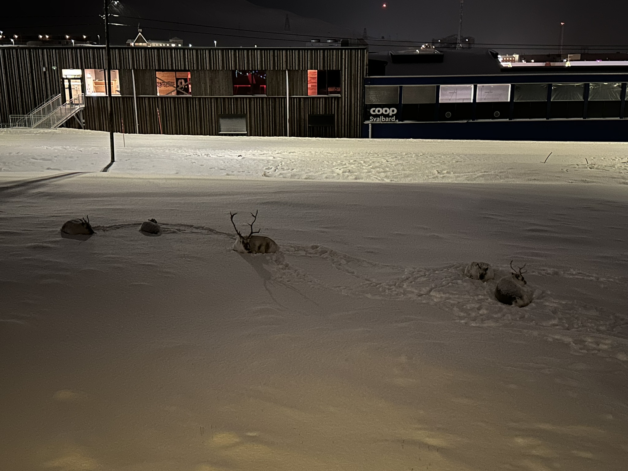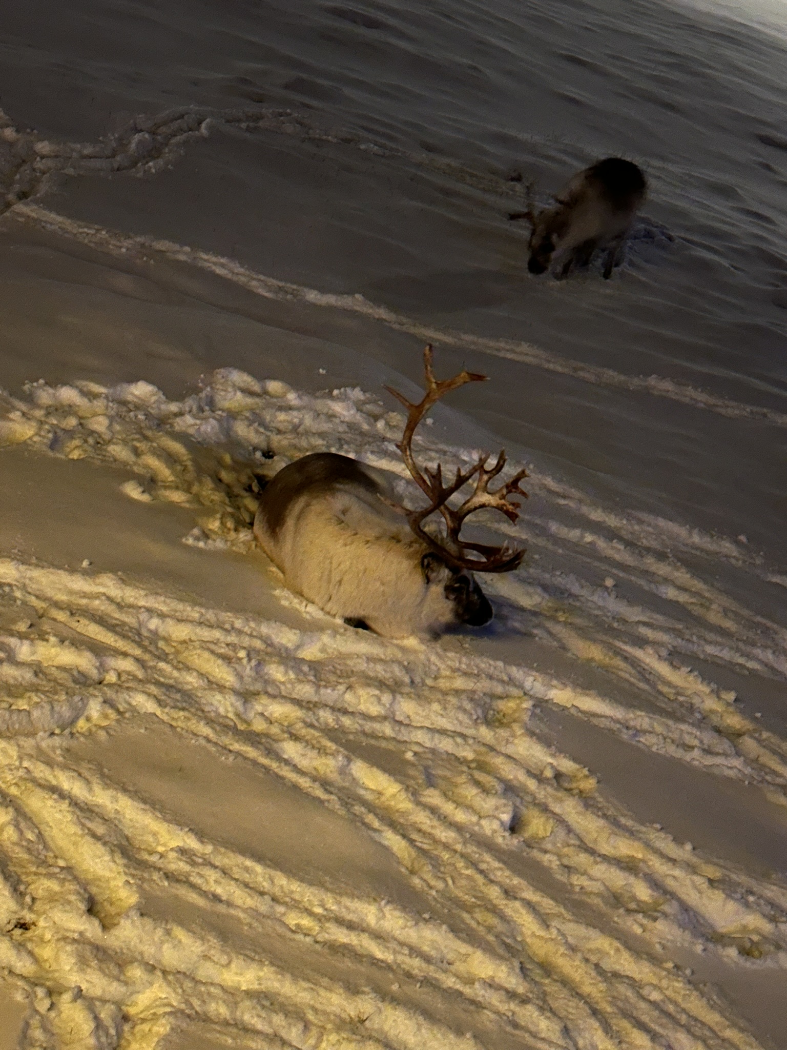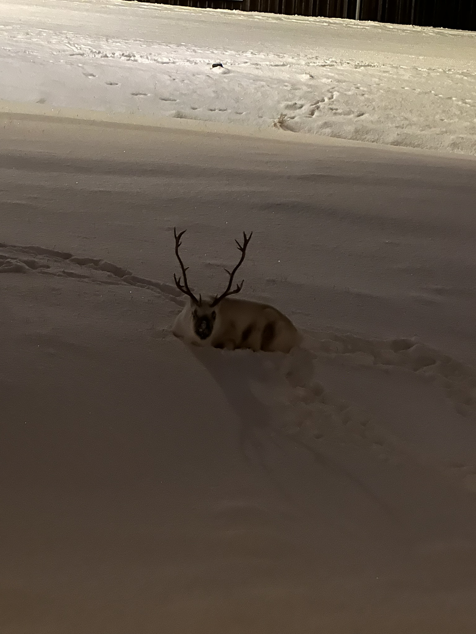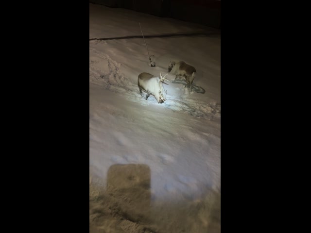 Møtte naboen akkurat i det et reinsdyr sto å kvessa geviret på en snøscooter i gata her. Det så ikke ut som han la merke til reinsdyret. For å henvise til dyret så sier jeg, «Koslig med besøk da», mens jeg nikker med hodet mot gevirkvesseren. Han snur seg ikke en gang og informerer meg uentuastisk om at de lusker rundt her hele mørketida. Ikke så spennende da med andre ord. Vi setter det på turistkontoen vi fremdeles har noen kroner på.