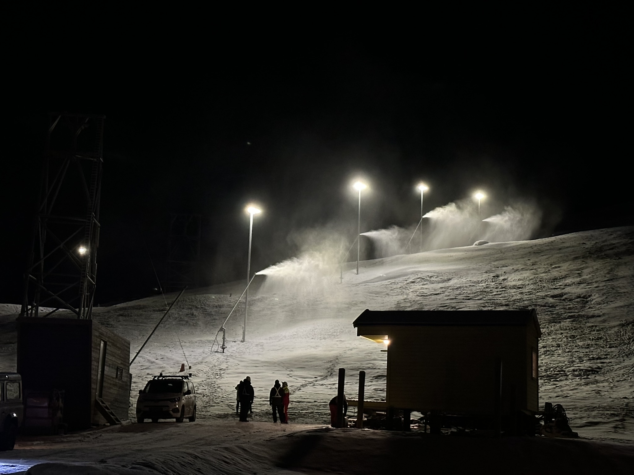 Det betyr jo også at det ikke snør så mye, derfor har de starta snøproduksjon oppe i alpinbakken bak huset vårt, Nedover. Ida og Knut, disse snøkanonene er bortimot lydløse, send tips til Granåsen.