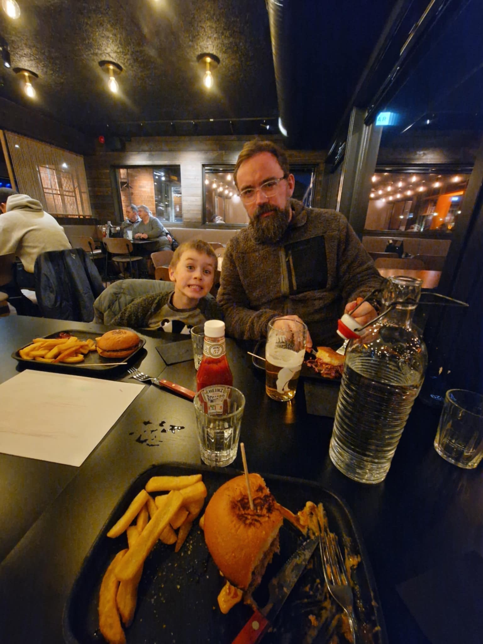 Nå rett før Arsenalkamp og lørdagsfilmen gikk vi ned på Svalbar for å spise burger. Jeg smaka wagyu for første gang.