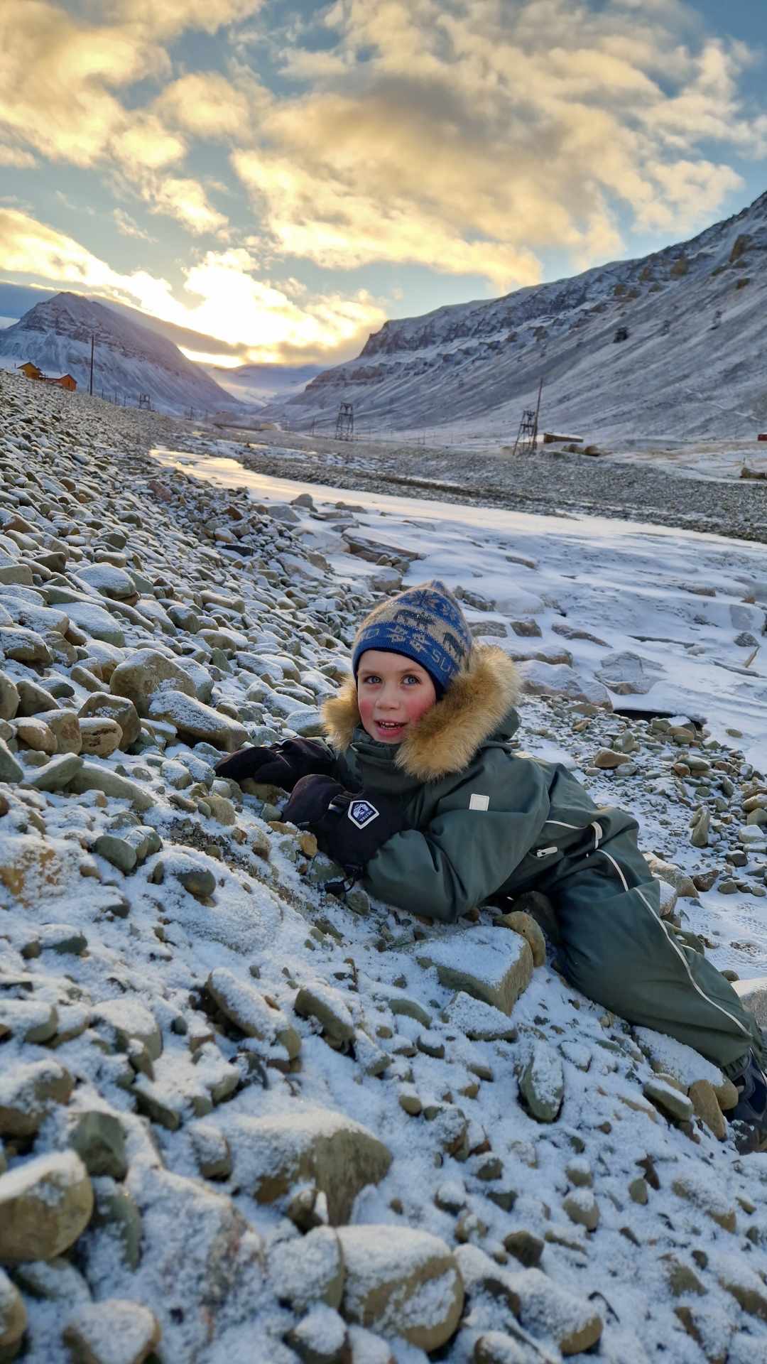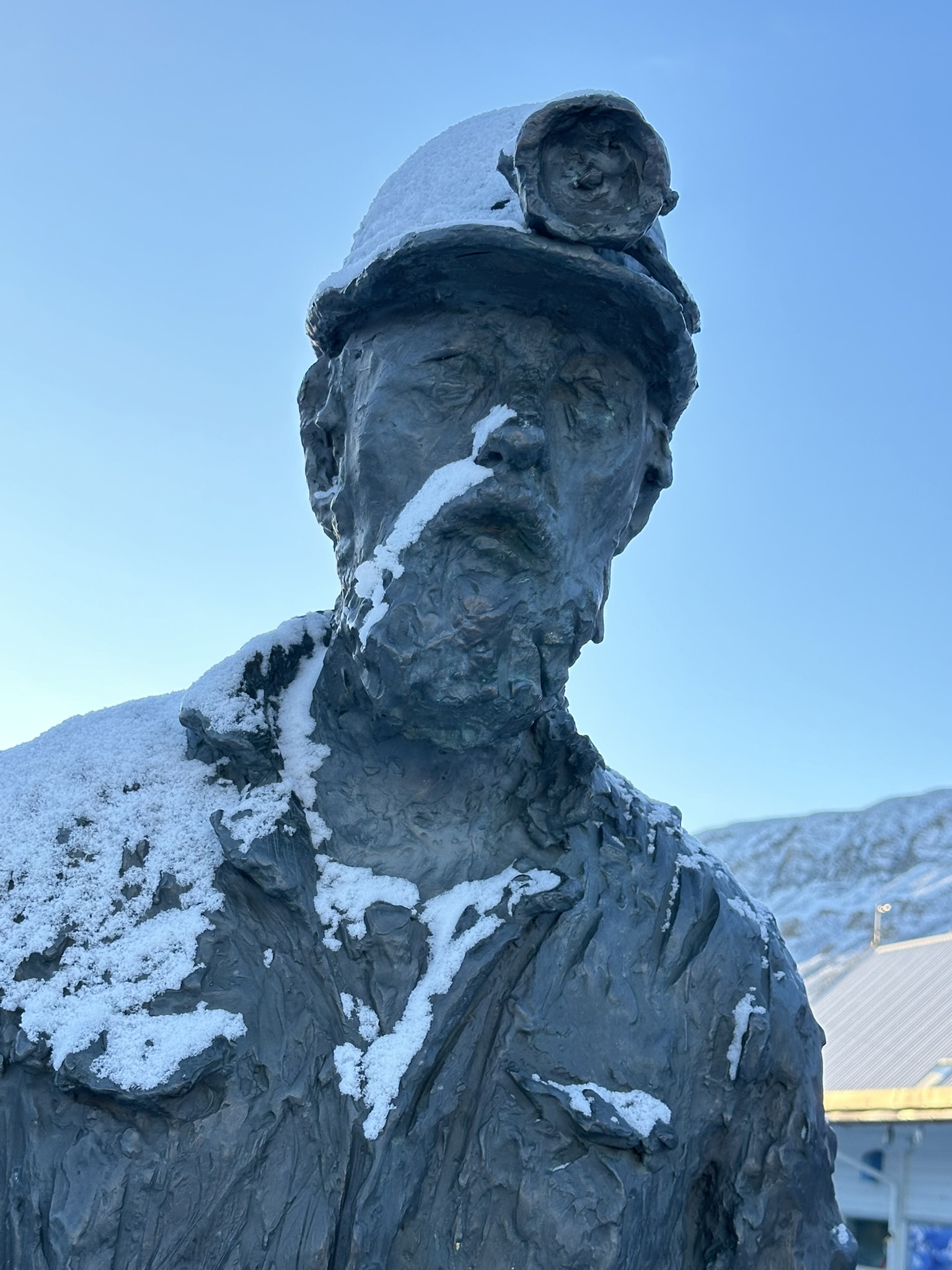 På vei hjem fra sykehuset gikk vi forbi statuen(gruvebusen). Jeg hørte Isak si, «det snør». Jeg ser opp, ser ikke et fnugg og svarer; «Nei, det gjør jo ikke det.». Isak peker på nesen til gruvearbeideren og sier, «Jo se, det er snørr.». Det har for øvrig snødd litt, også er det jo litt kaldt. -3 her, er jeg ganske sikker på at er 10 grader kaldere enn i Trøndelag. Ikke snakk om at shortsen er mulig utendørs.