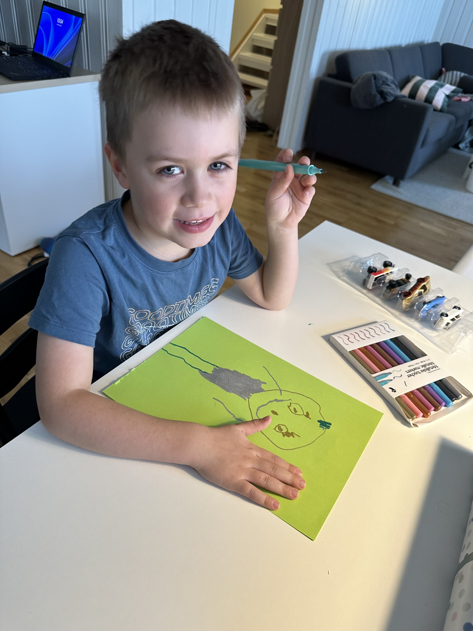 Vi leita overalt etter ballonger, fant ingen, måtte improvisere. Tegna litt, pakka inn blomster(Lego) og laga kort. Jeg spurte hva vi skulle skrive i kortet, så skrev jeg det han sa. Venta spent i sofaen.