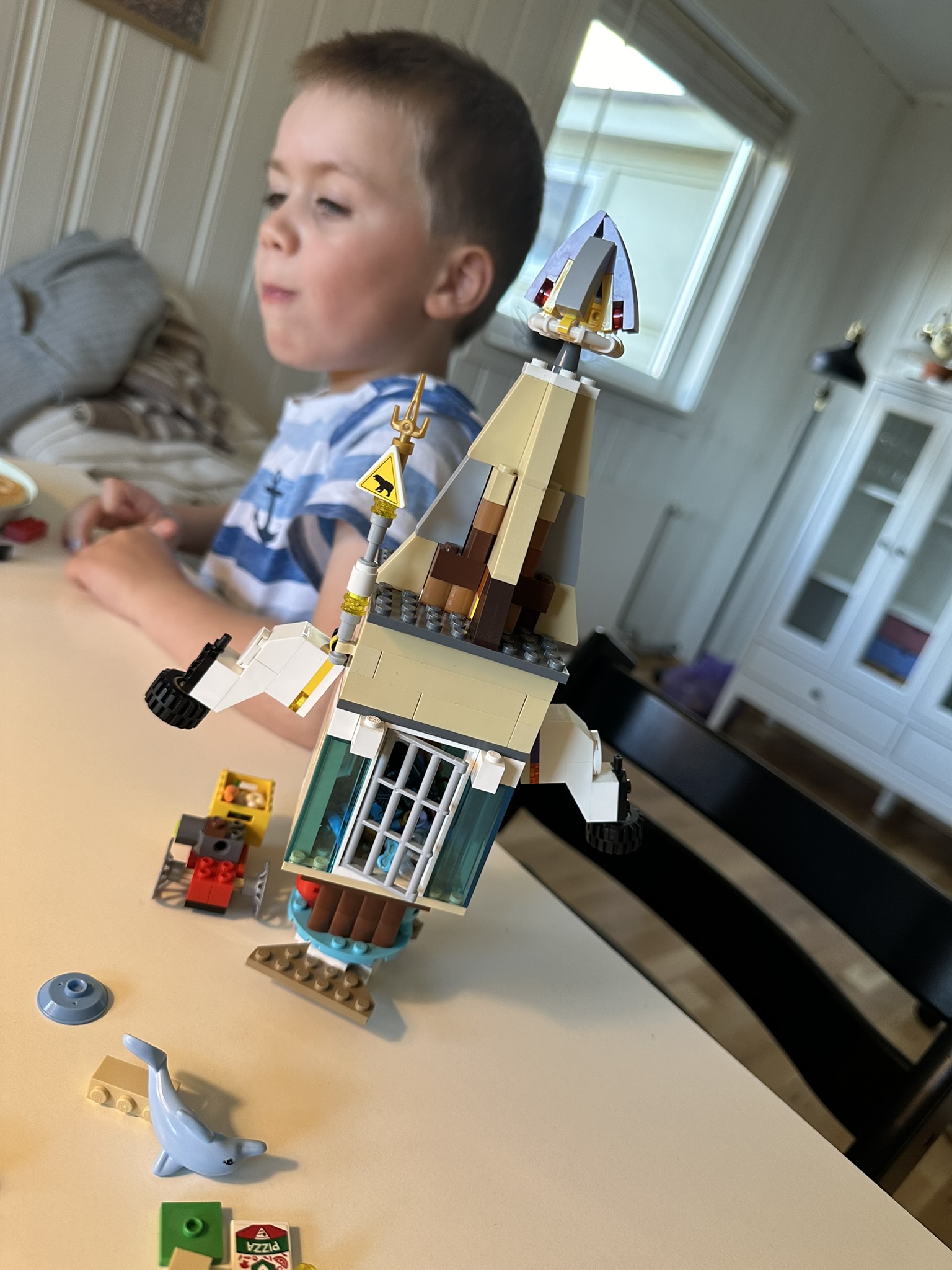 Vi bygde en egenkomponert romrakeeet når vi kom hjem. Innholdsrik rakeeet, med eget fengsel, solarseil, pizzarestaurant og isbjørnskilt. Snart middag, hørte nettopp rykter om dessert.