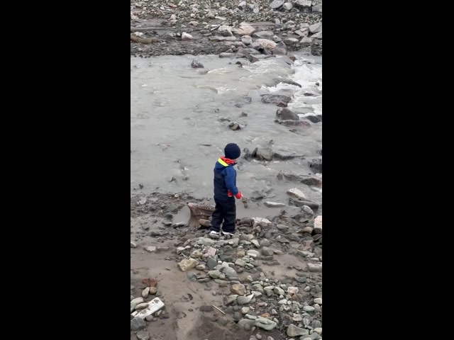 Sola gløtta frem mellom skyene på vei tilbake, og reflekteres på snødekte fjelltopper. Det vises på elva at det er kaldere, mindre smeltevann å kaste steiner og trepinner i. Likevel en favorittsyssel for Isak.