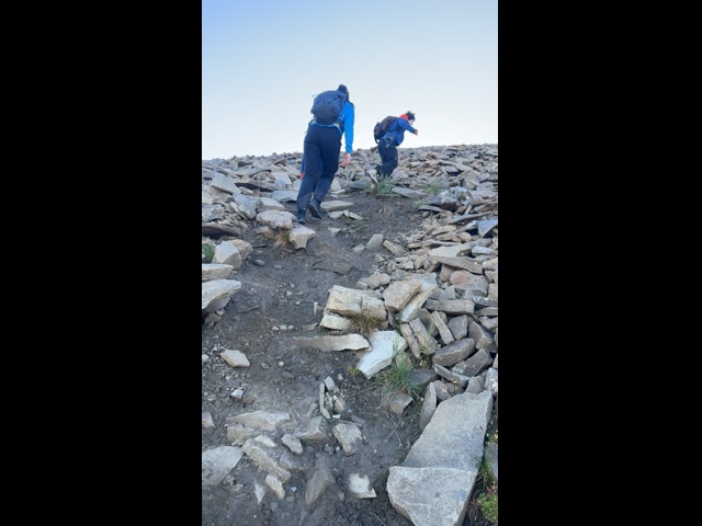 Når det blir brattere er det en grei sti, litt steinete. Forbi den andre varden er det bare stein, bratt er det også. Så for meg en utfordrende tur nedover for Isak. Ingen grunn til bekymring, viser seg han har fjellgeit-gener. Lørdagsgodt nå, det er fortjent, han er sliten.