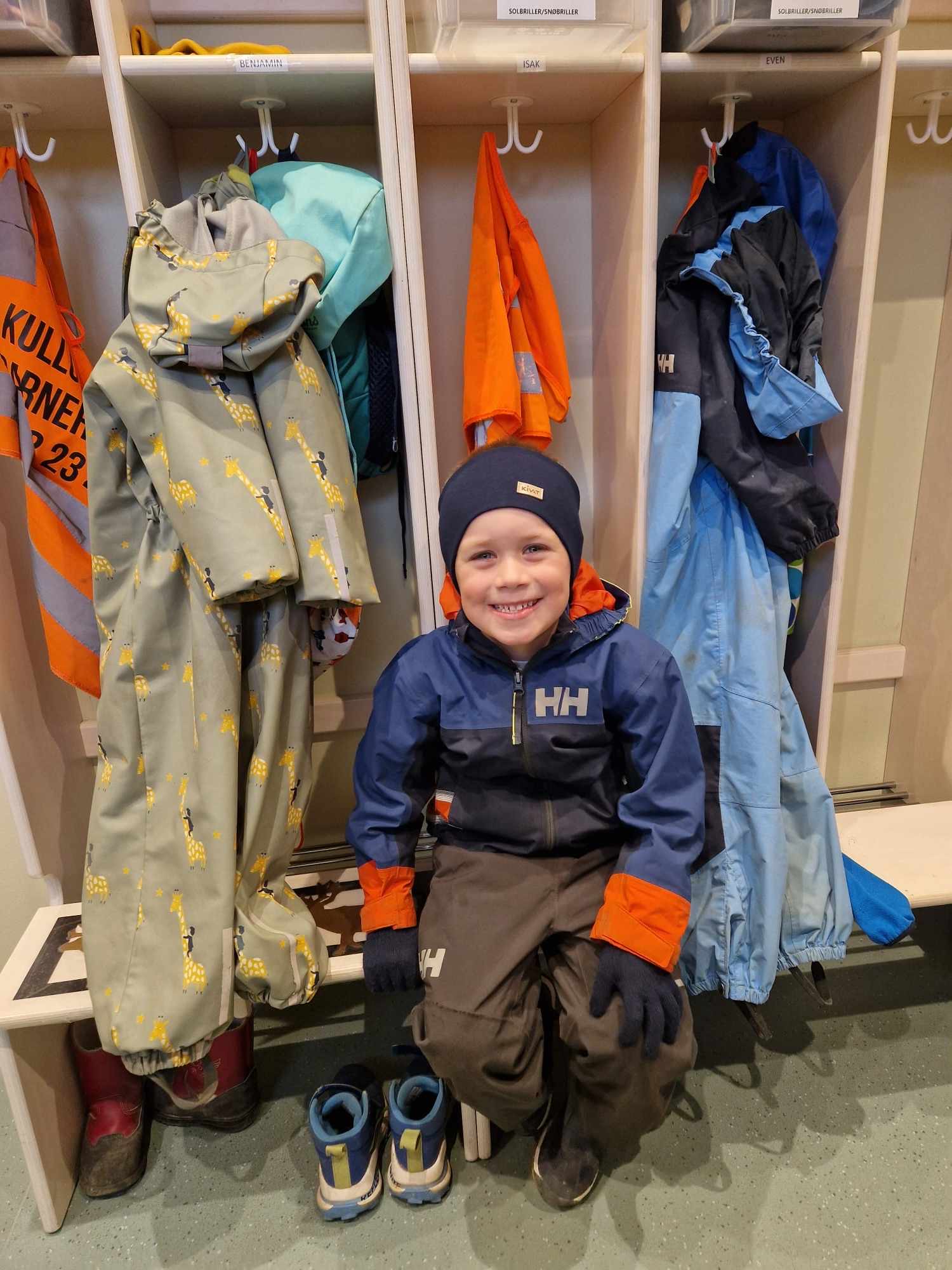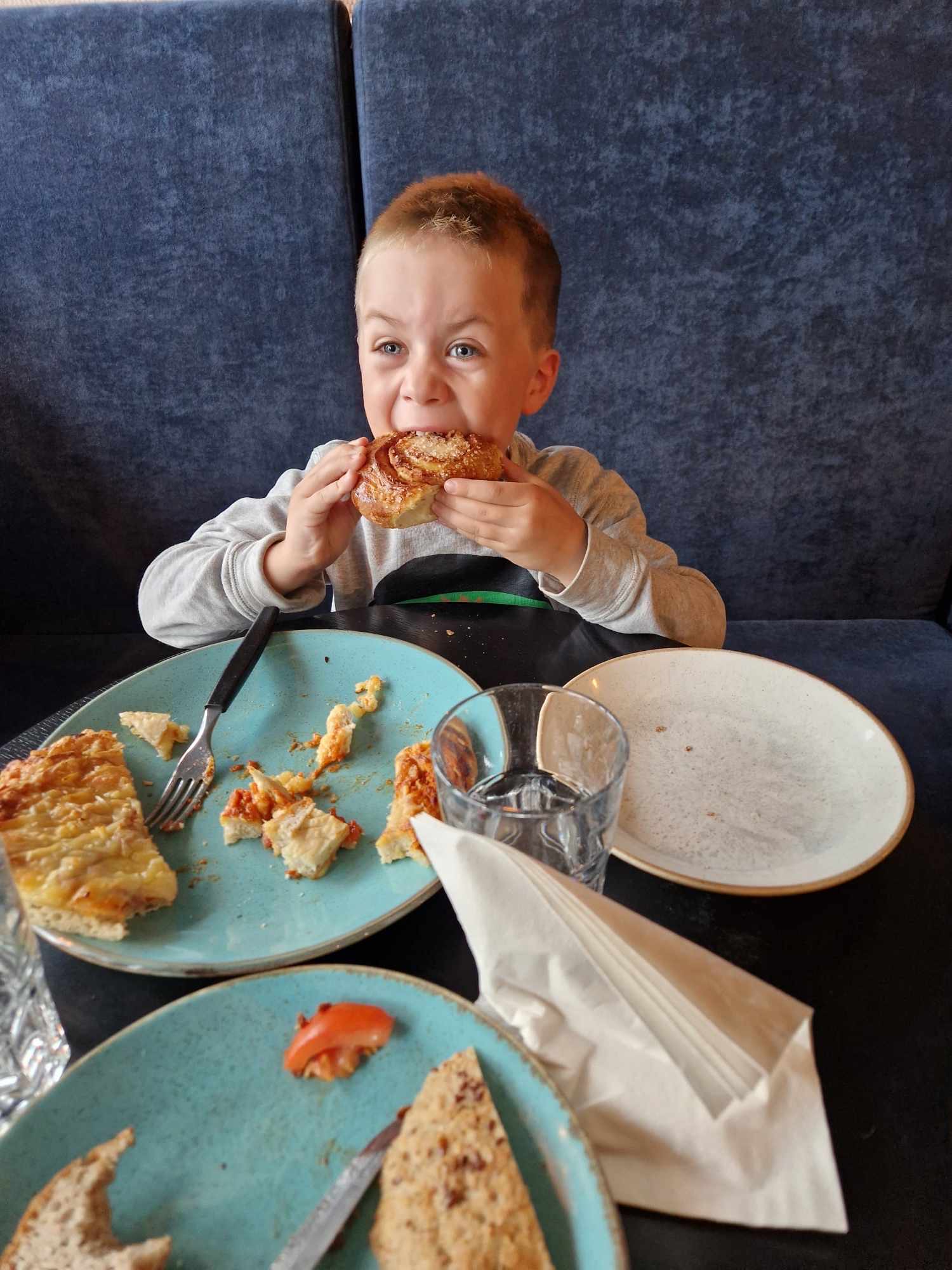 Velfortjent lunsj når første dag i barnehagen ble avsluttet etter noen timer. I morgen blir jeg med nedover og Isak skal prøve seg litt uten forelder tilstede. Det går nok veldig bra.