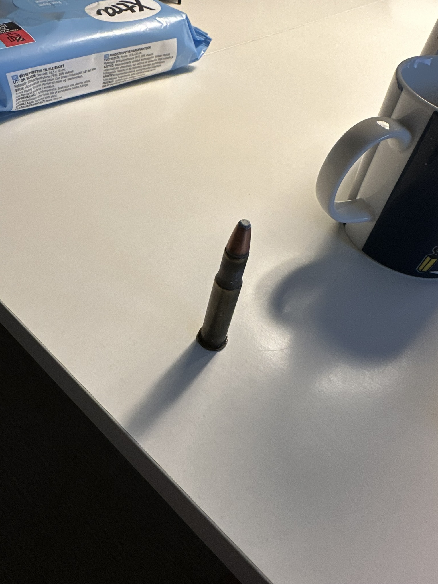 I dag ble det belønning på Isak i lunsjen. Fikk med en 30-06 som fulgte huset også, Hanne fant den i belgen på vaskemaskina. Er visst nok ikke uvanlig å finne ammo i kriker og kroker 🙂