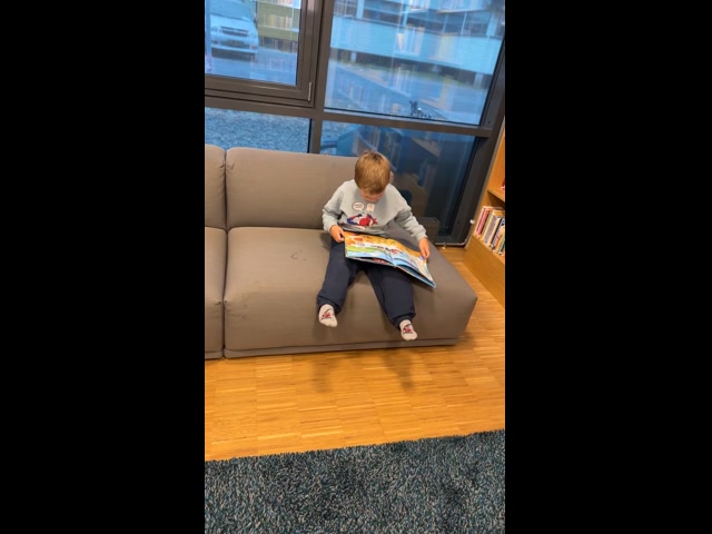 I lunsjen gikk vi ned til biblioteket for å låne nye bøker, på veien møtte vi den tidligere nevnte naboen, fem og et halvt-åringen, Alfred. Sammen med pappan sin og lillesøster, ble de med ned til biblioteket. Guttene fant tonen, og løste oppgaver i en bok sammen. Konkurranseinstinktet til Isak slo inn et par ganger, men det viste seg at Alfred også hadde det. Tror det ble uavgjort. God stemning!