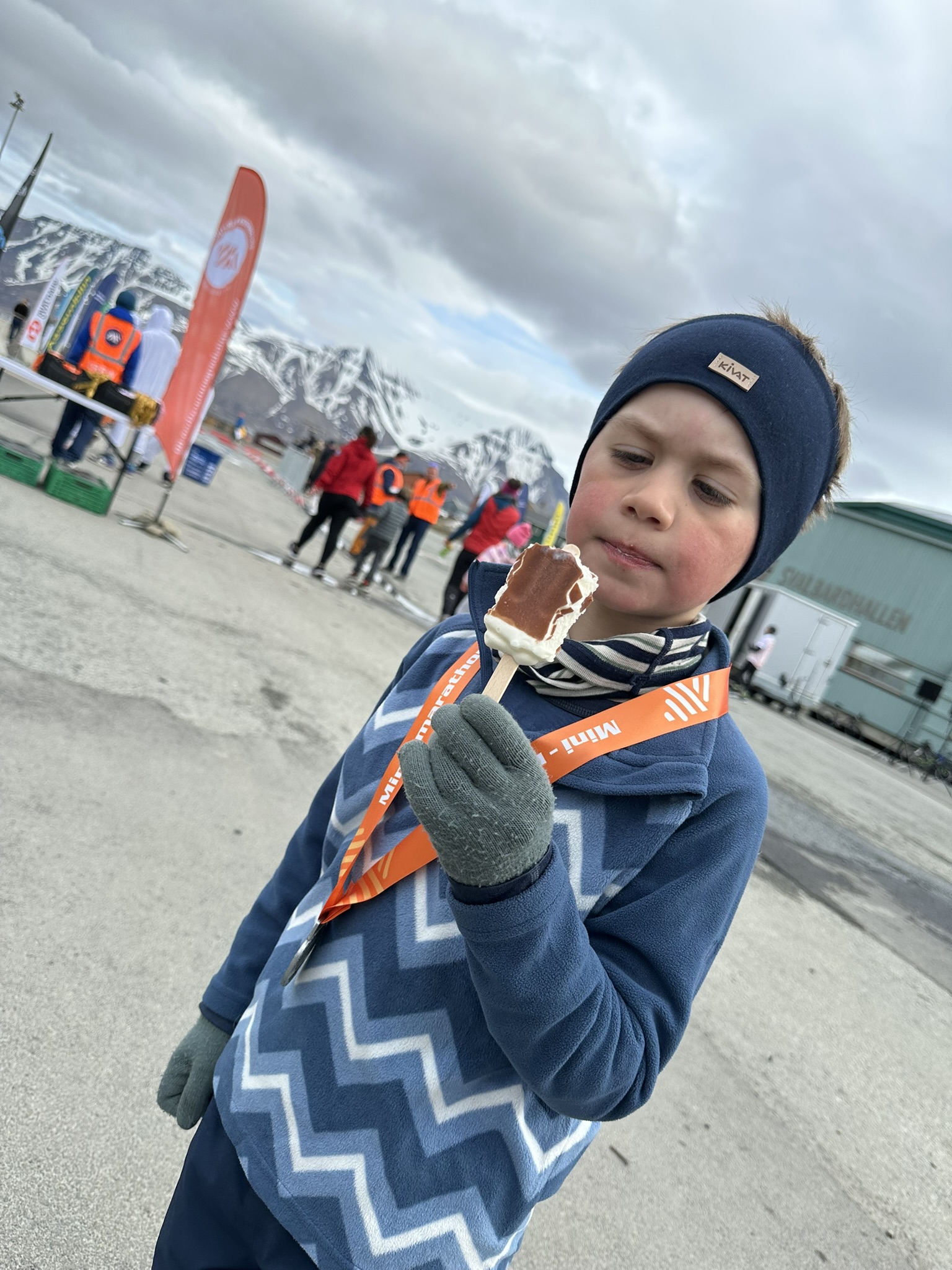 Løypa gikk fra idrettshallen, opp forbi Funken og ned på veien til Polarflokken. Derfra en lang motbakke opp til mål. Én kilometer ble raskt unnagjort, men må jobbe med innspurten. Etter målgang var det medalje, is og saft. Vi gikk inn i hallen for å varme oss litt, her var det jaggu kanelsnurrer, kaker og kaffe å få kjøpt også. Skikkelig bra arrangement.
