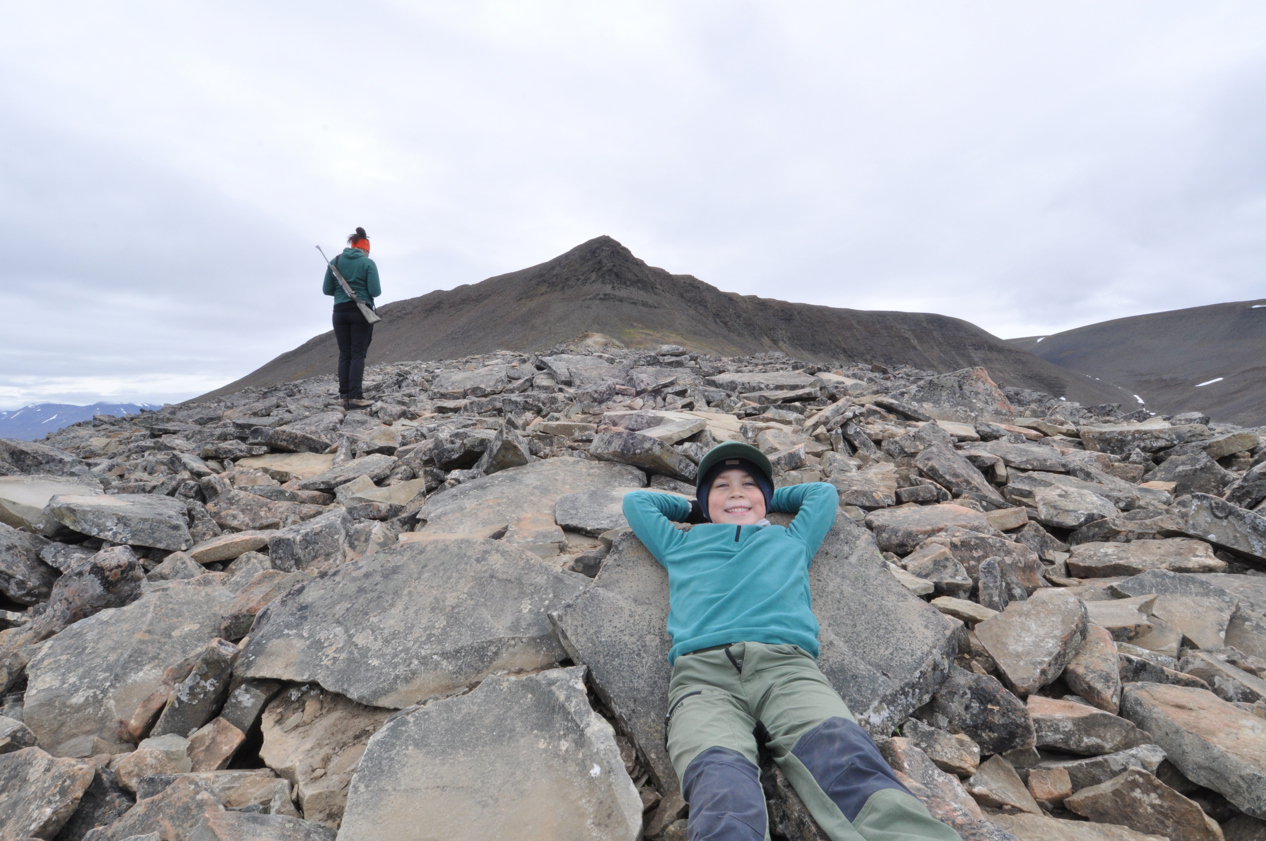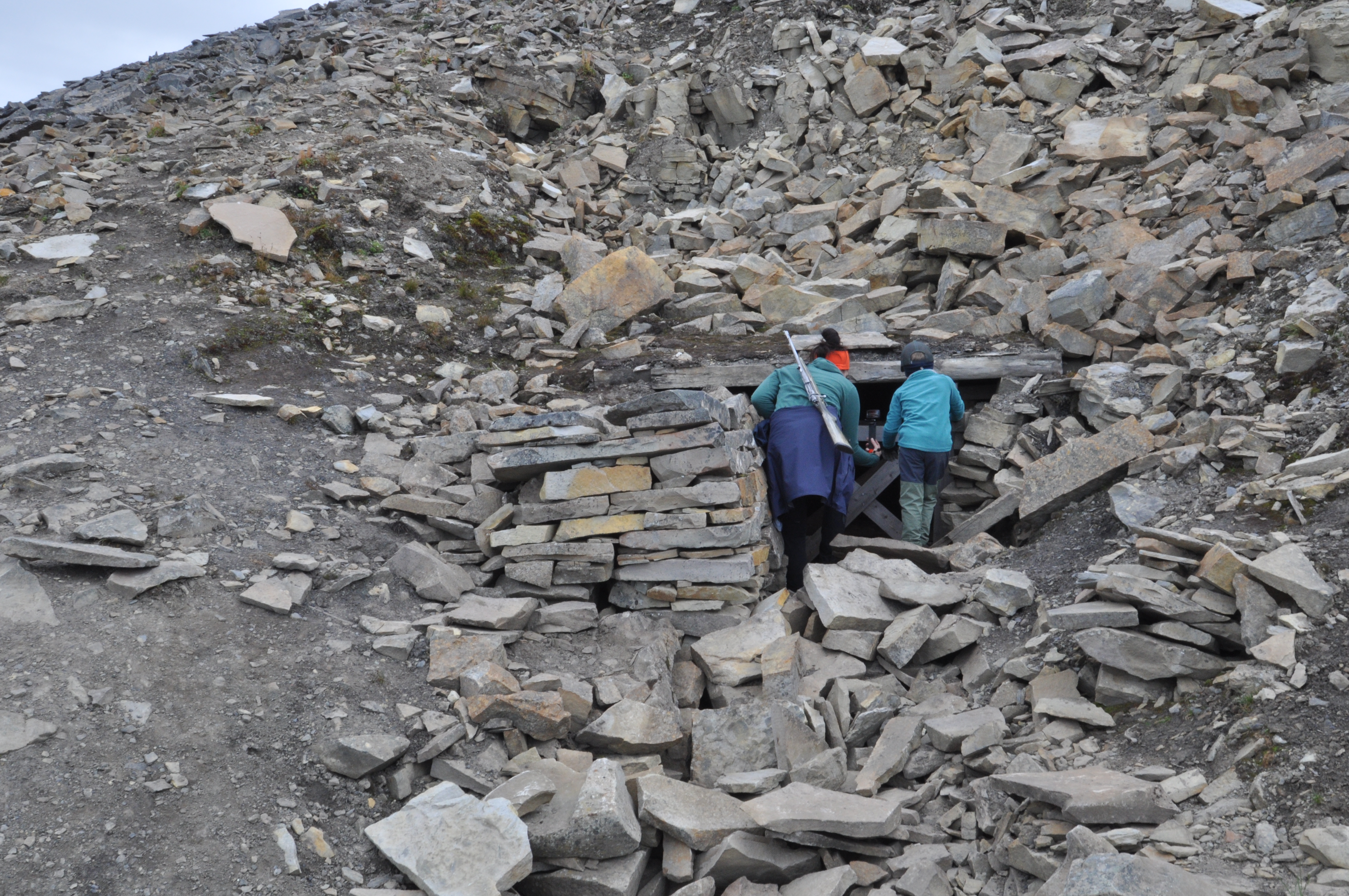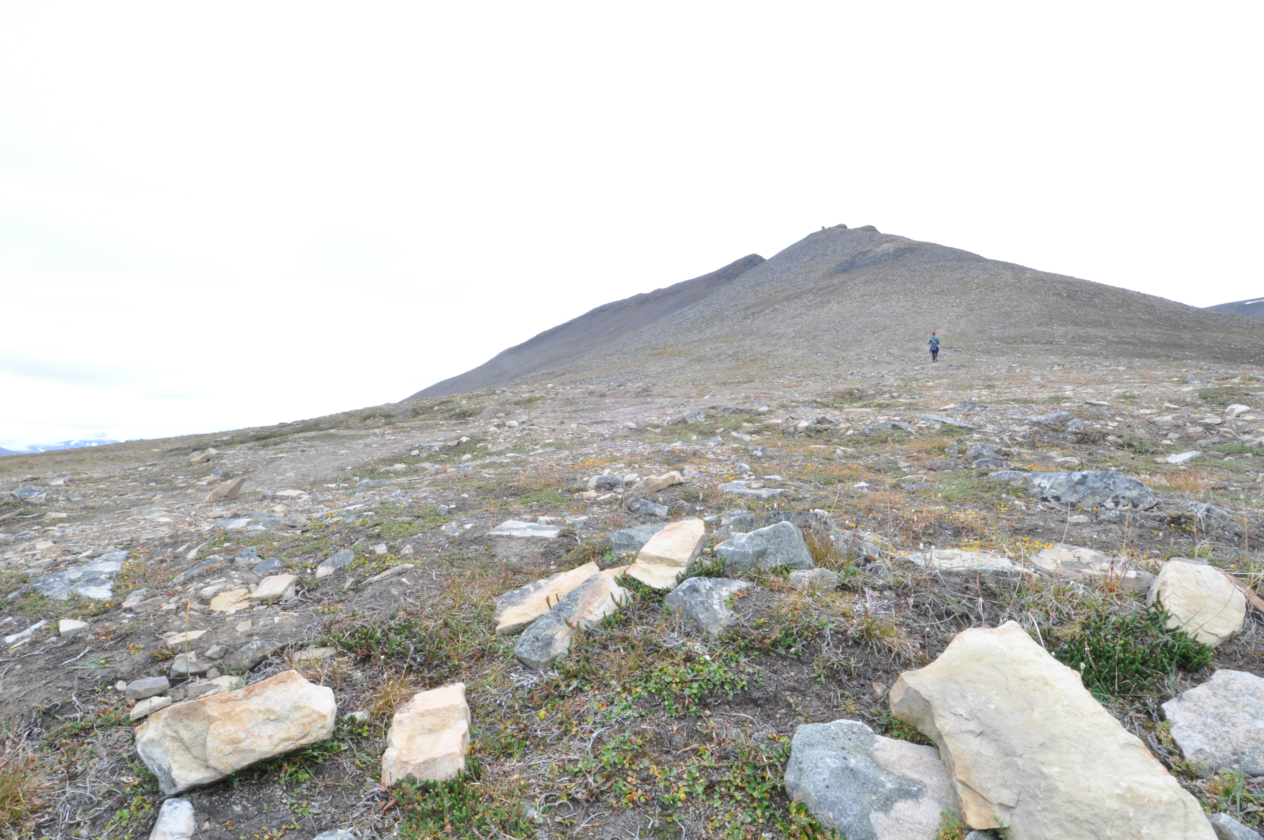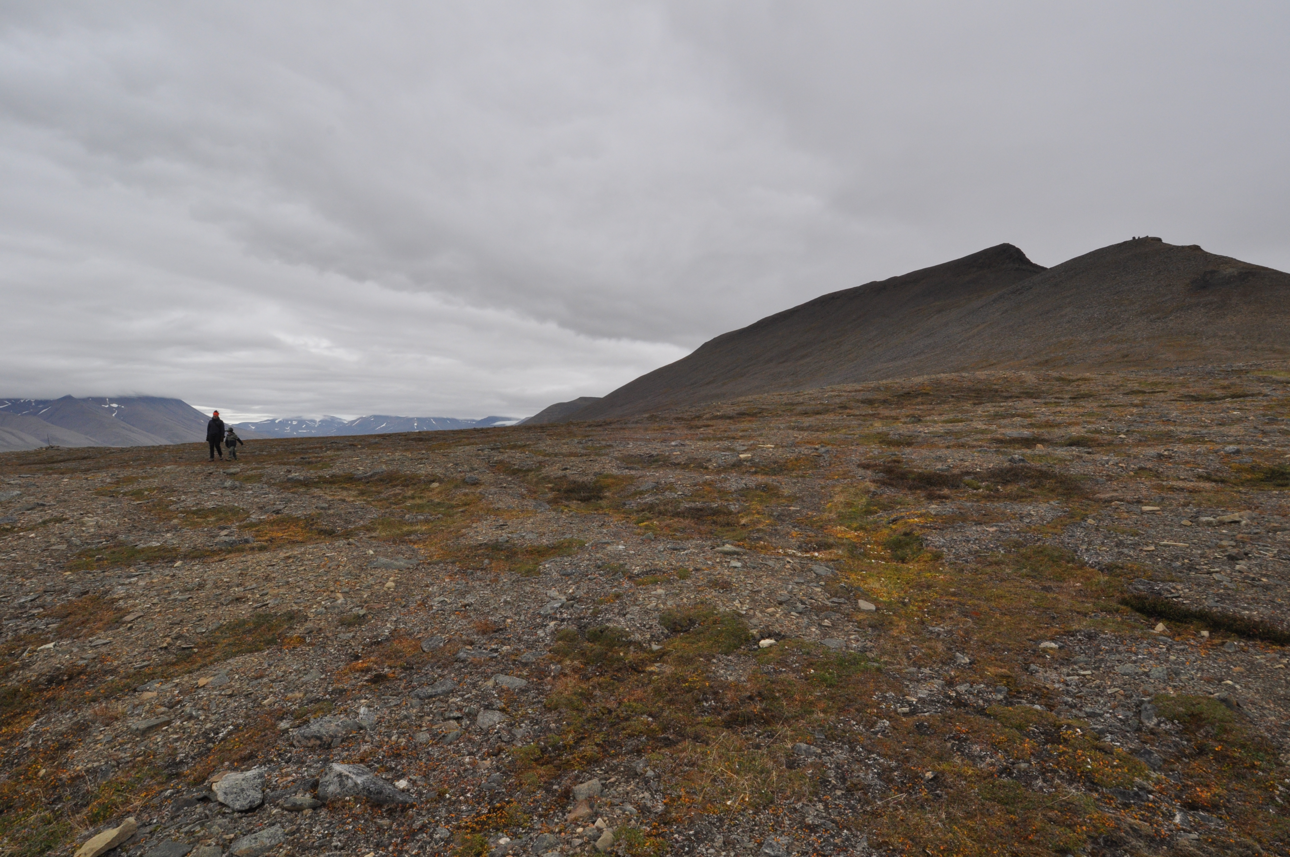 Blomsterdalen ligger like ved frøhvelvet og vi parkerer nede ved Burmastien. Vi gikk opp tundraen og til Blomsterdalshøgda. Isak raser opp de 295 høydemetrene over 3,5km. Må bare få litt "bensin" til strategiske tider. Rett før toppen fant vi Trøndergruva, et spennende kulturminne. På toppen fant vi turboposten og turboka, her så vi 10-topper-deltakerne hadde vært i natt. Blomster fant vi også, i Blomsterdalen naturlig nok. I Svalbardloven står det tydelig at vi bare kan se på plantene som vokser på tundraen. Ingen blomsterplukking med andre ord. På vei ned det bratteste partiet fortalte Isak en vits, til god latter fra meg og Hanne. Vitser har blitt en greie for Isak.