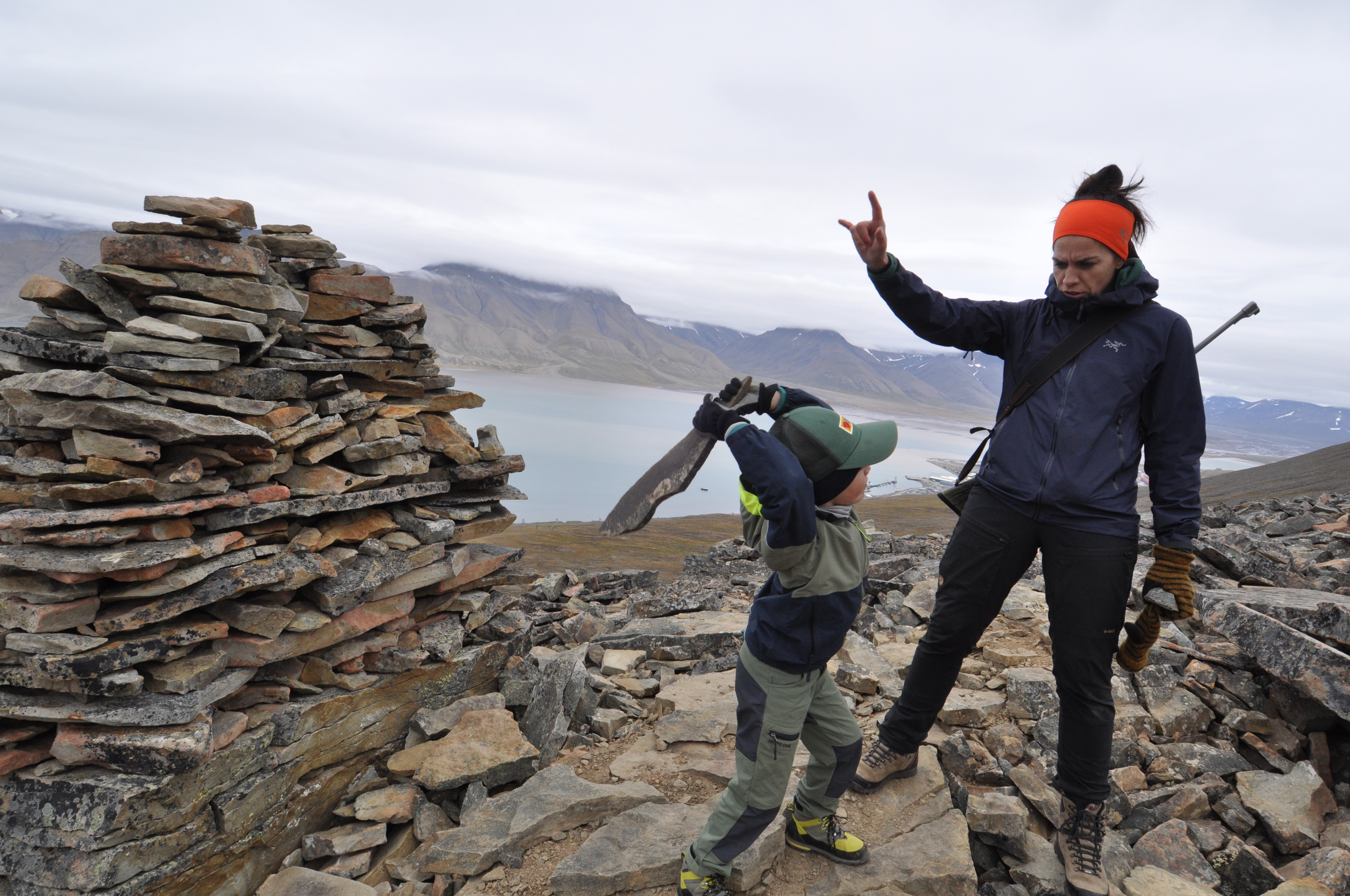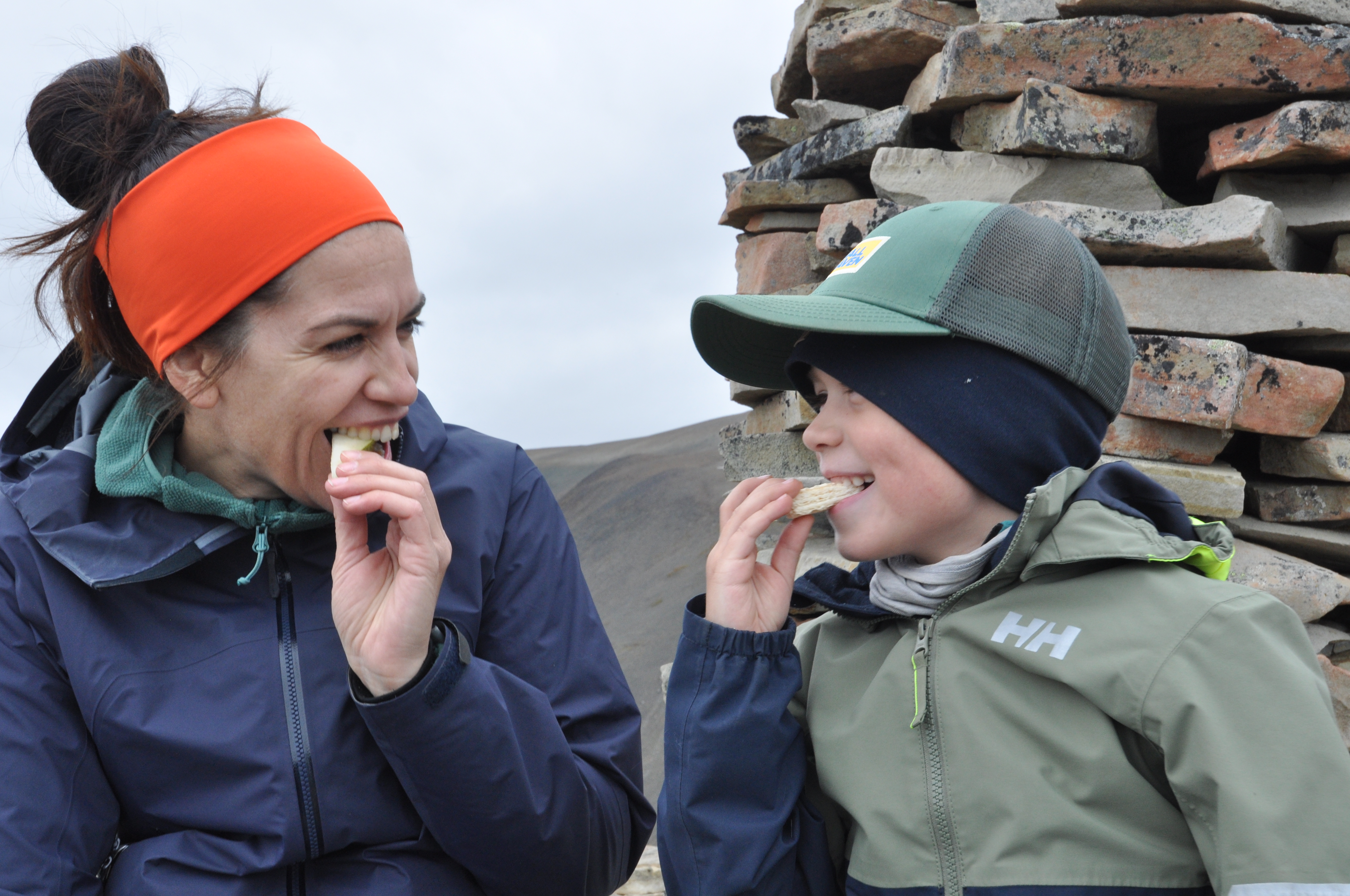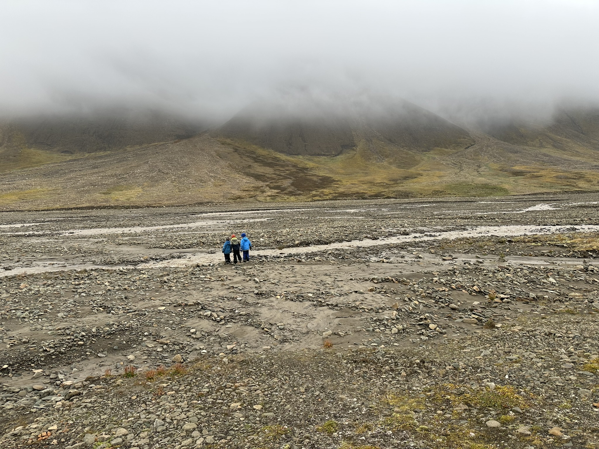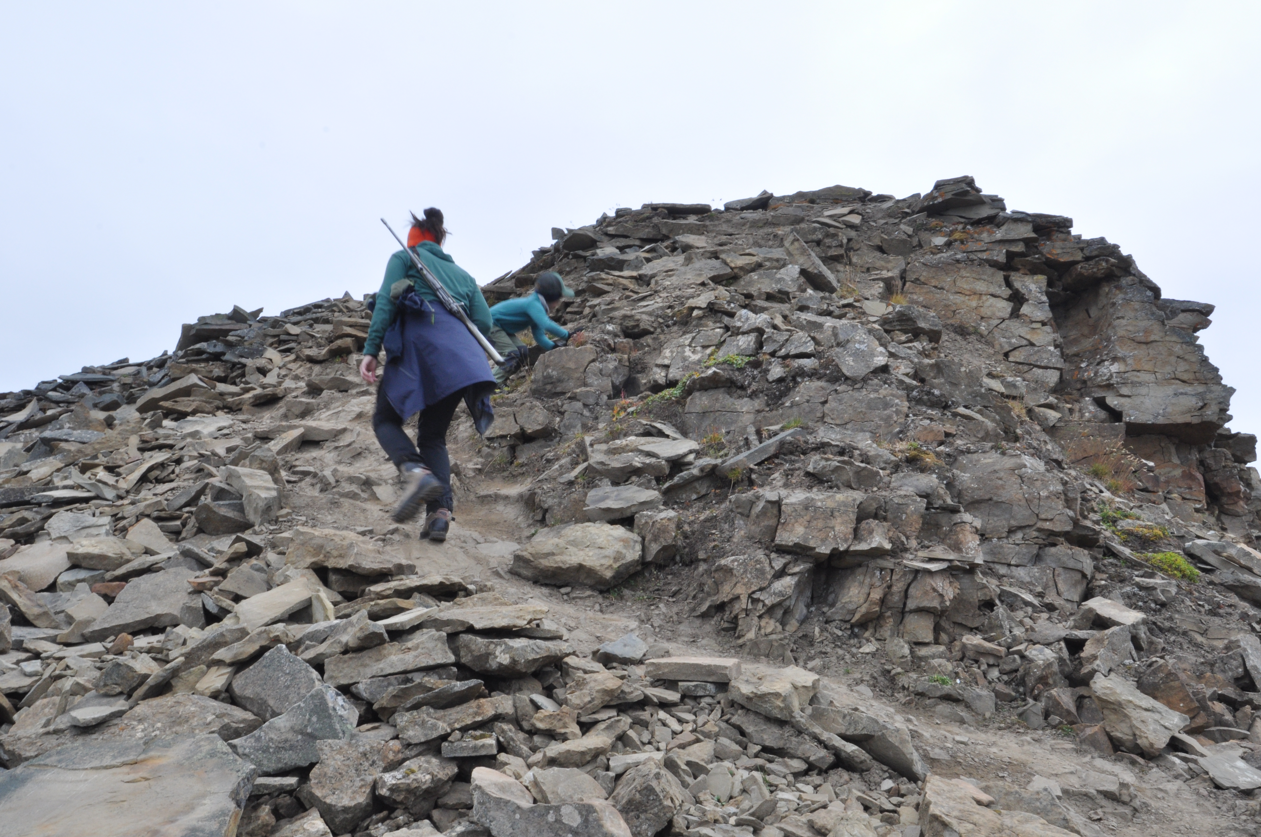 Blomsterdalen ligger like ved frøhvelvet og vi parkerer nede ved Burmastien. Vi gikk opp tundraen og til Blomsterdalshøgda. Isak raser opp de 295 høydemetrene over 3,5km. Må bare få litt "bensin" til strategiske tider. Rett før toppen fant vi Trøndergruva, et spennende kulturminne. På toppen fant vi turboposten og turboka, her så vi 10-topper-deltakerne hadde vært i natt. Blomster fant vi også, i Blomsterdalen naturlig nok. I Svalbardloven står det tydelig at vi bare kan se på plantene som vokser på tundraen. Ingen blomsterplukking med andre ord. På vei ned det bratteste partiet fortalte Isak en vits, til god latter fra meg og Hanne. Vitser har blitt en greie for Isak.