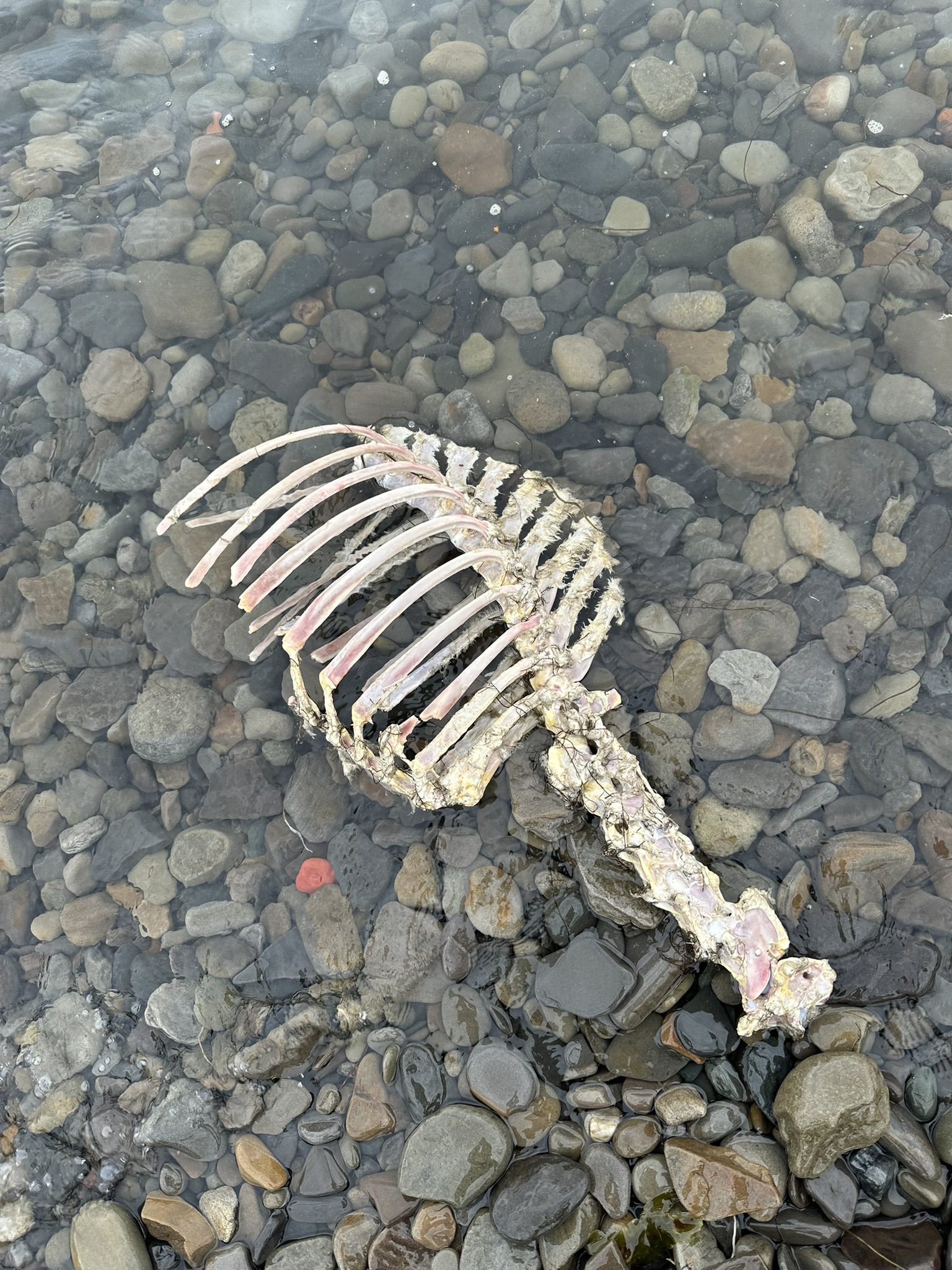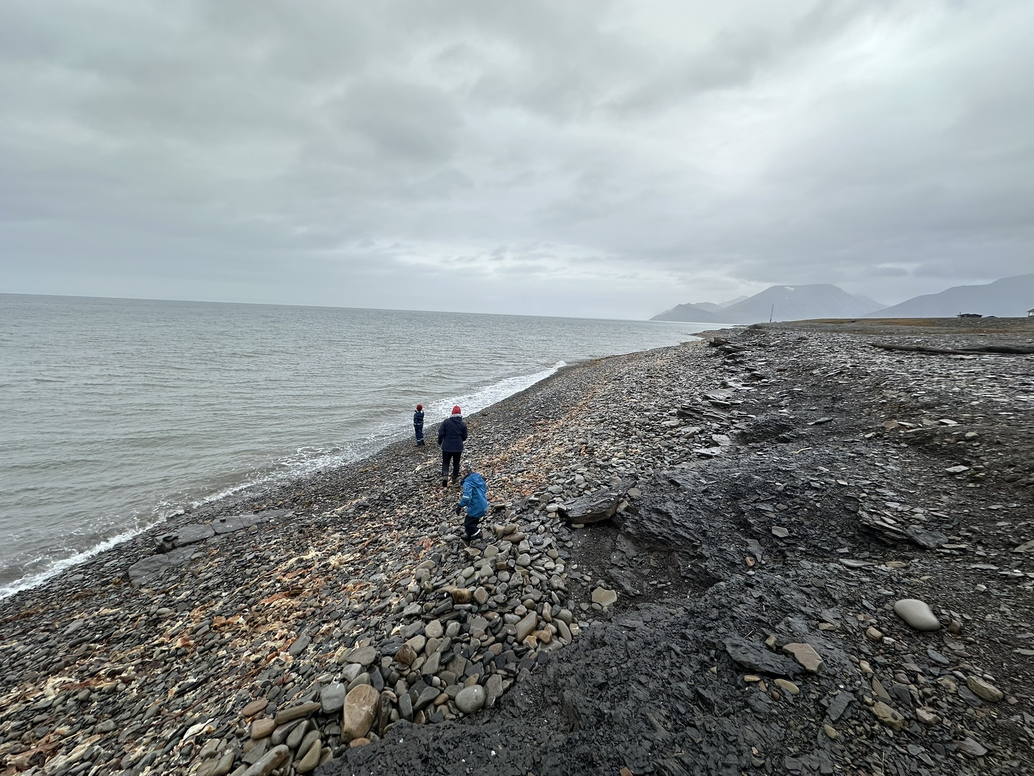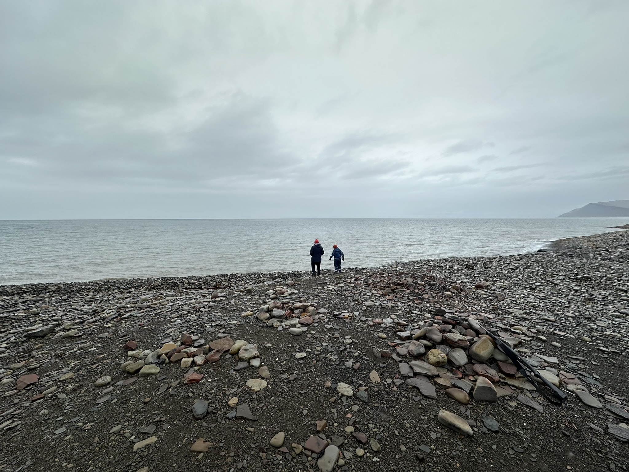 I dag har vi vært på tur i grått og surt vær. Fjæra er en favoritt og sammen med naboene fant vi ut at det var fest i sjøkanten. Ved Hotellneset satt det rundt 50 polarmåker gode og mette. Hvithvalene legger igjen en del matrester, masse renplukka beinrester i fjæresteinene. Vi fant også beinrestene av et pattedyr. Vi sendte bilde av det til en del gammeltanter for identifisering, men vi ødela hele greia og spurte AI. AI var ikke i tvil, det var beinrester av en beluga. Fikk ikke noe svar på hva som hadde skjedd med den da. Kanskje isbjørn, kanskje ikke. Vi kjørte også ut til Vestpynten for å spise opp kvikk-lunsjen vi hadde med. Naboene spanderte Orio-kjeks og kakao.